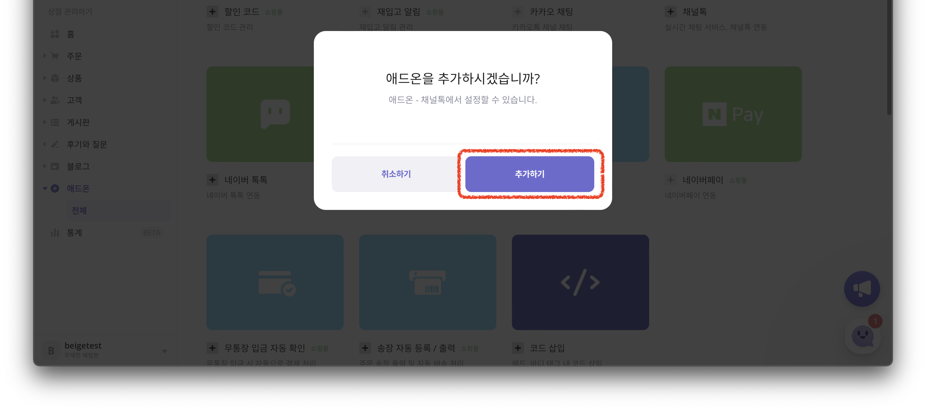 1. 식스샵 관리자 페이지에서 [애드온] > [전체] > [채널톡] 을 클릭해 애드온을 추가해주세요.