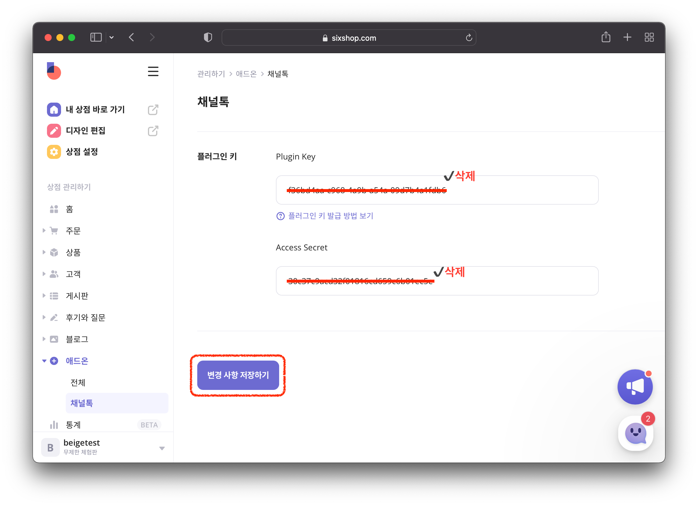 • 식스샵 관리자 페이지 [애드온] > [채널톡] 에서 Plugin Key와 Access Secret 값을 지운 후 [변경사항 저장하기]를 클릭하면 채널톡 설치가 해제됩니다. 설치를 해제해도 채널에서의 기존 상담 내역은 삭제되지 않습니다.
