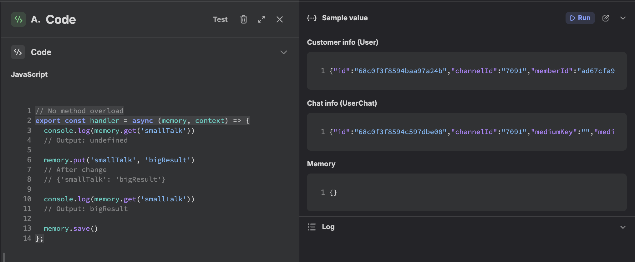 The test includes customer information (User), consultation information (UserChat), and memory (Memory) by default. As shown in the sample values, no values are currently stored in memory. It's an empty object.