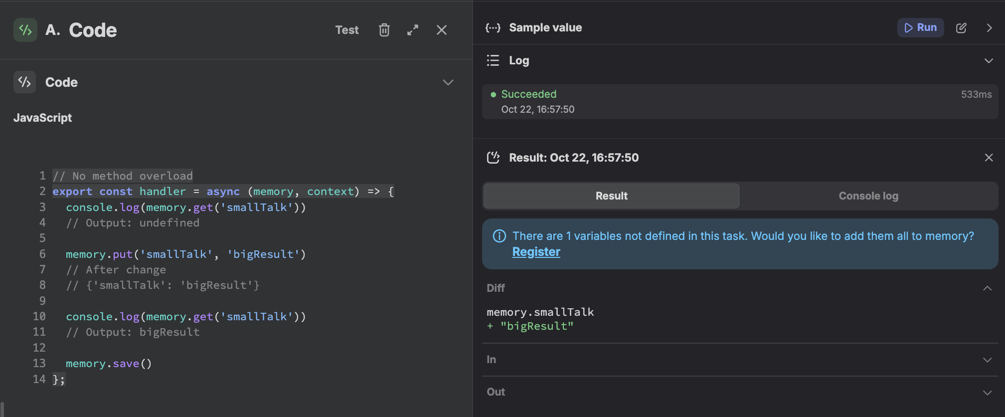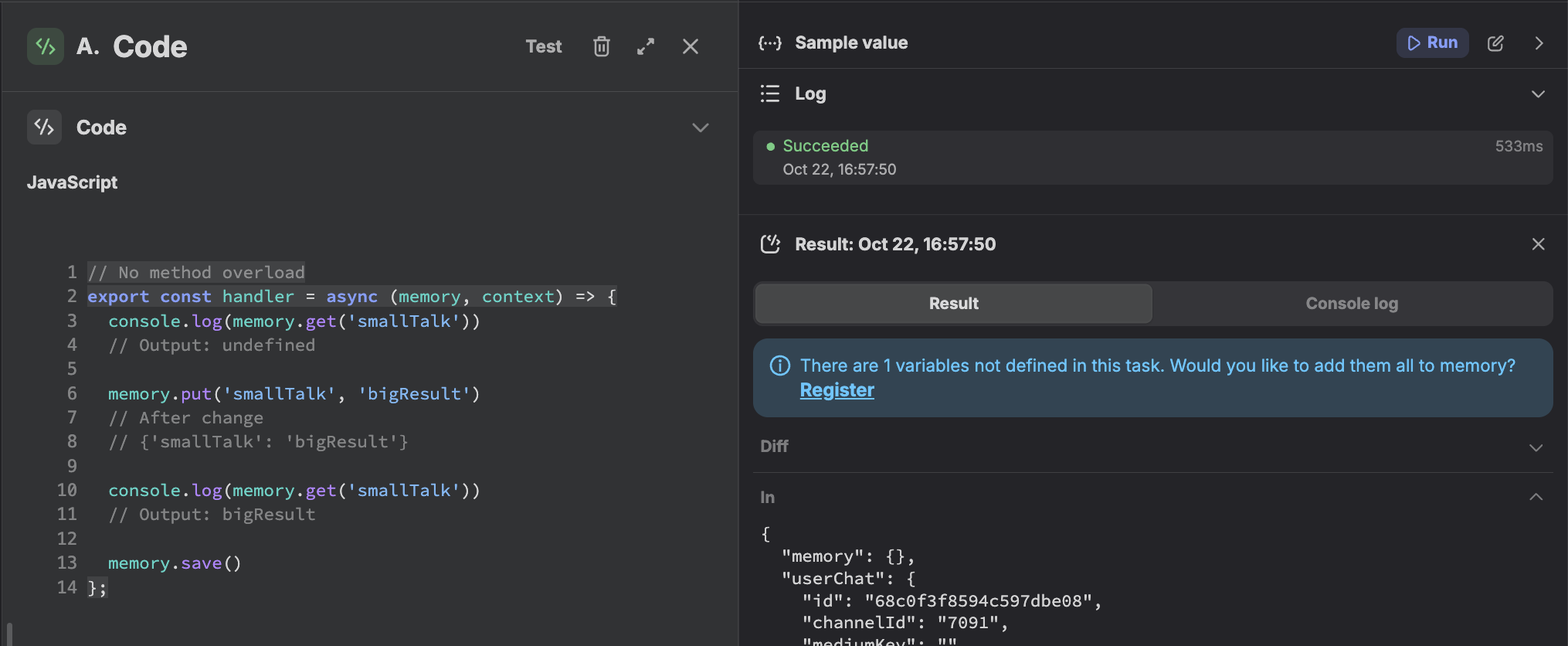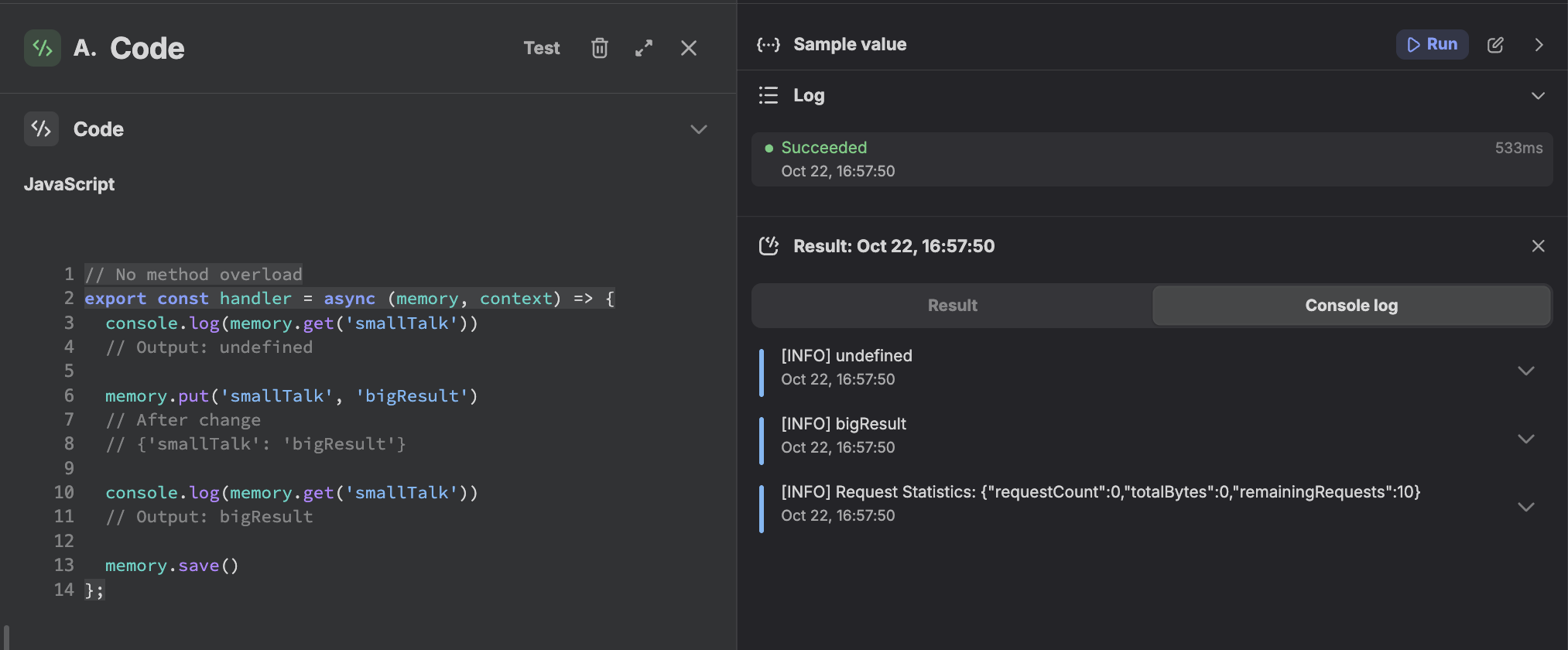 In the In tab under Result, you can check the actual values of memory, userChat, and user that were input when the code was executed in JSON format.