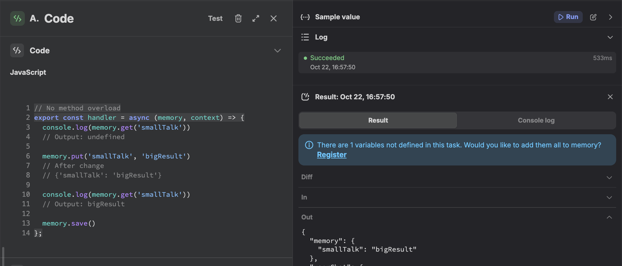 As shown in the Out tab, the value "bigResult" is stored in the "smallTalk" key under "memory".