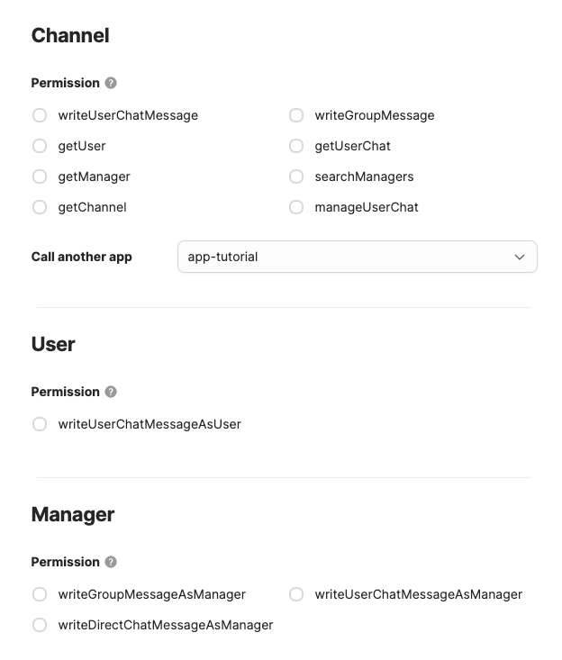 Channel | チャネルが実行可能な操作に対する権限 | ボットメッセージ送信、ユーザーおよび管理者情報の確認など |