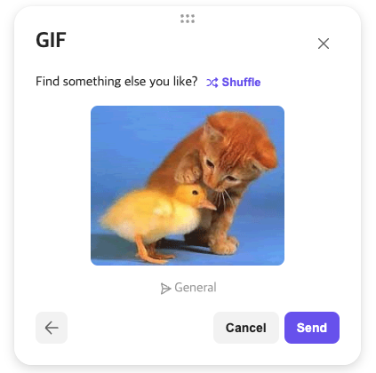 /gif 2. チャットウィンドウに/gif <search keyword>と入力した場合、そのまま Command を実行すると、該当する <search keyword> に適合するGIF 画像を表示します。