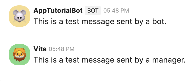 writeGroupMessage: ボットがグループにメッセージを投稿します。(アプリで実行する操作)writeGroupMessageAsManager: チームメンバがグループにメッセージを作成します。(WAMで実行する操作)