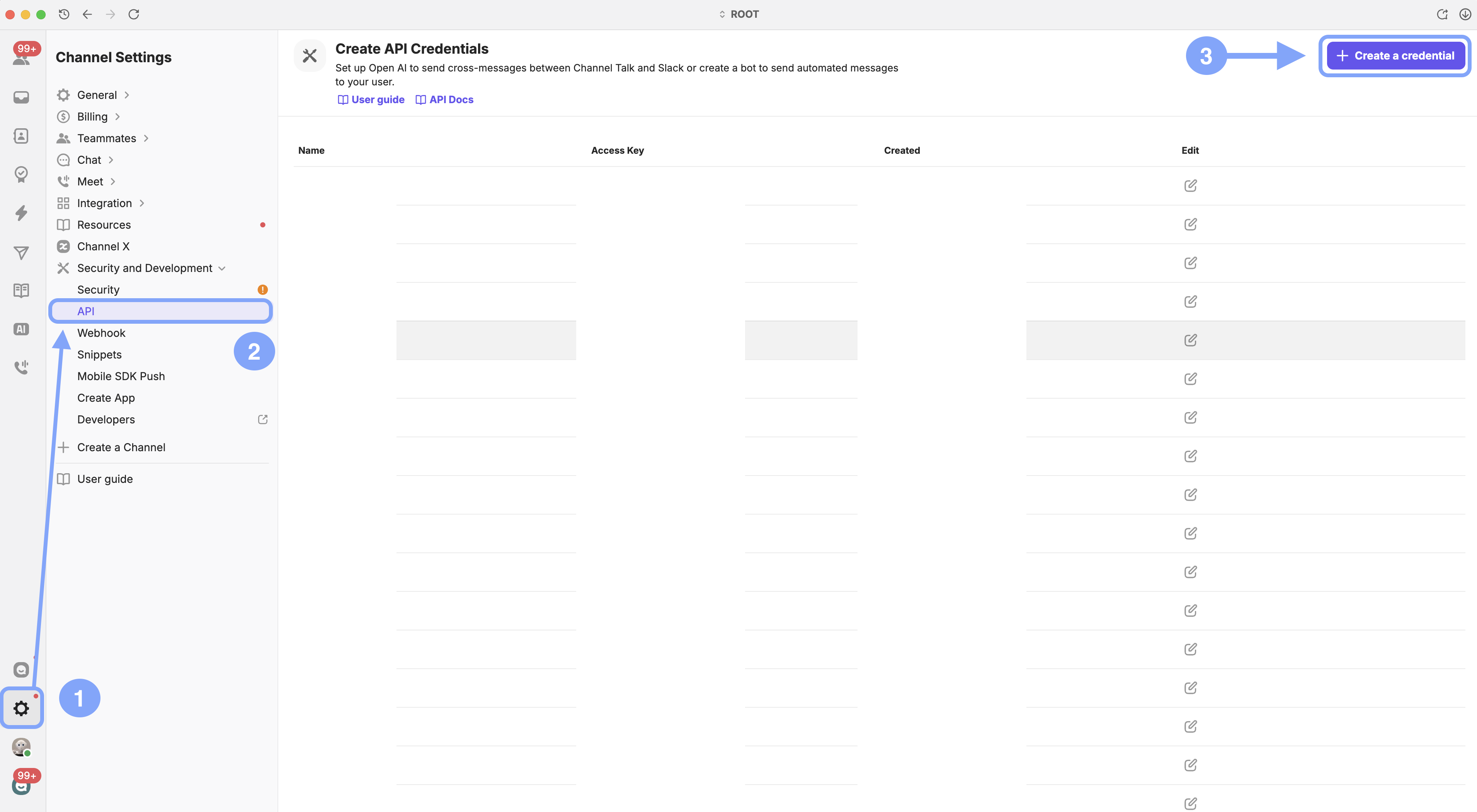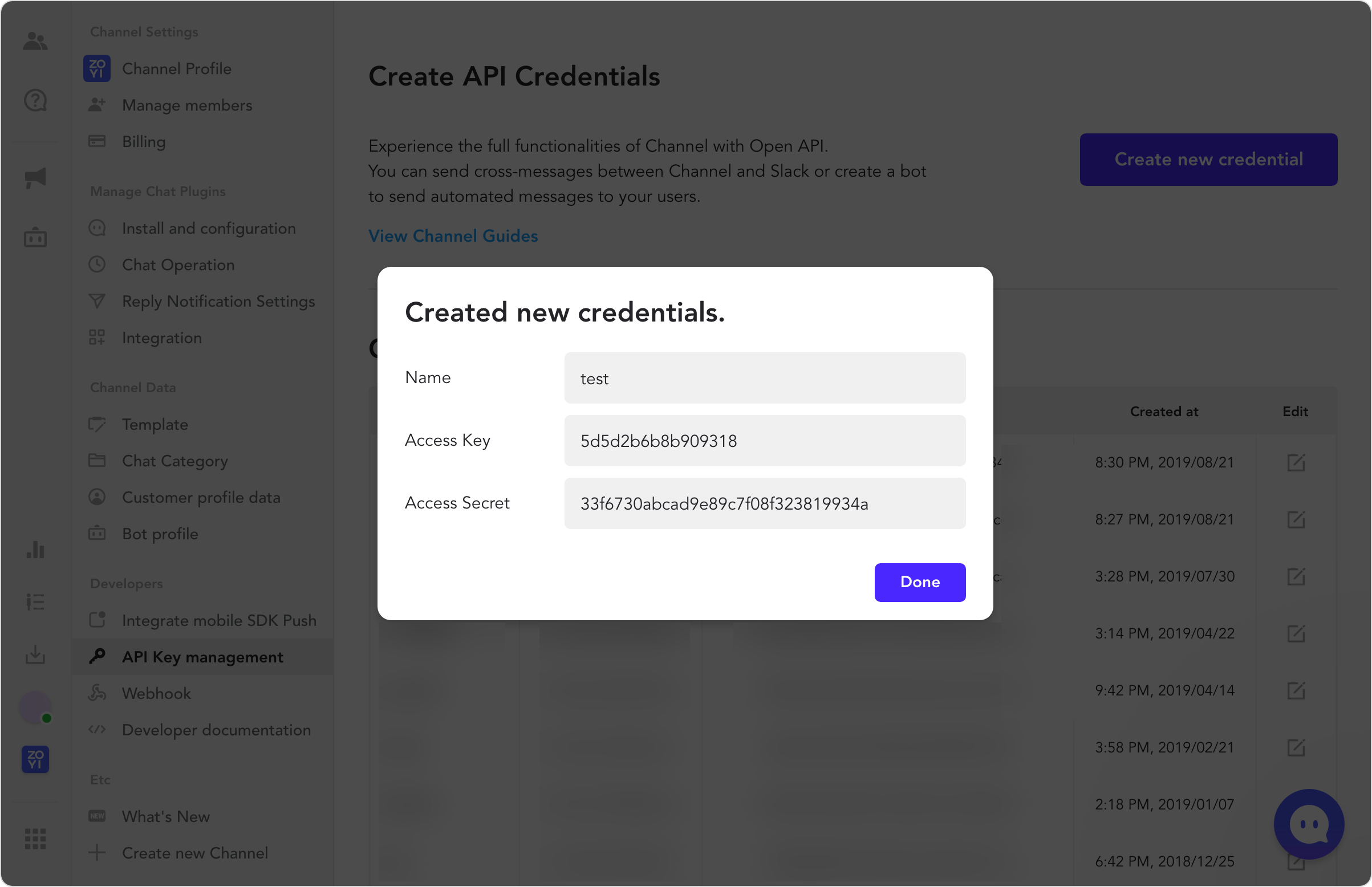 チャネル管理画面で、[チャネル設定] - [セキュリティ・開発] - [API管理] で、[+新しい認証キーを作成] をクリックします。API認証情報に名前を付けて [確認] を押します。