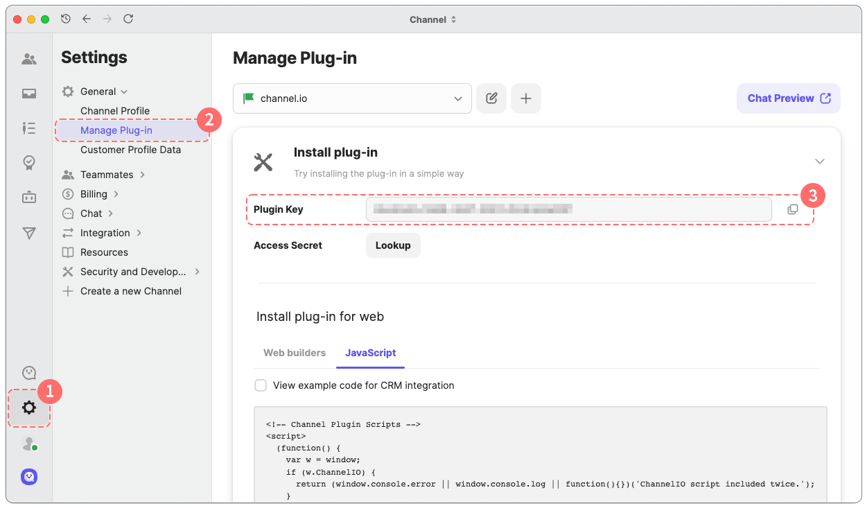 Web管理画面の [チャネル設定] - [基本設定 ] - [ボタンの設置・設定] - [チャットボタンの設置] でプラグインキーを取得できます。