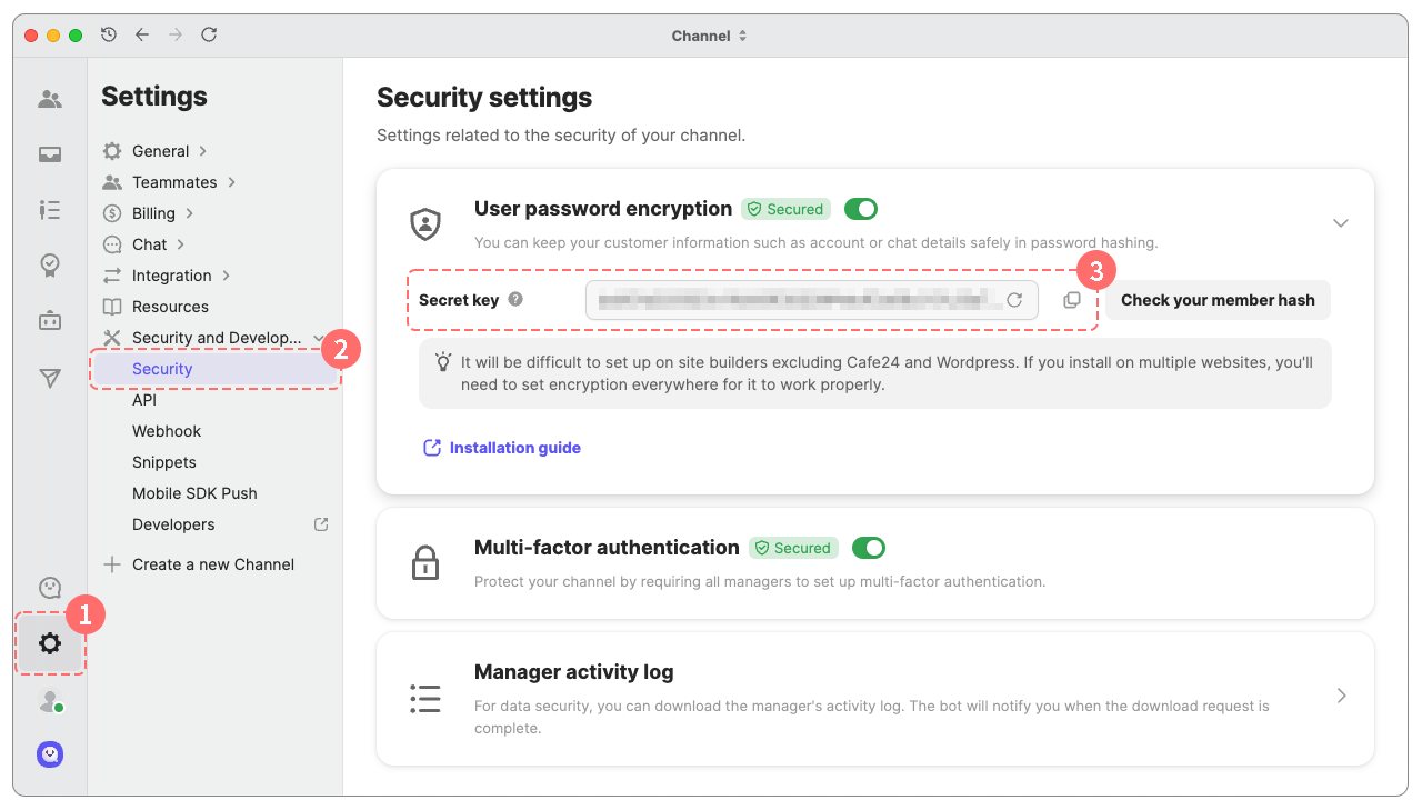 メンバーハッシュ機能は、チャネルトークSDKの設定をすべて完了した後に有効化する必要があります。インストールが完了していない状態で機能を有効化すると、チャネルトークSDKが動作しない場合があります。