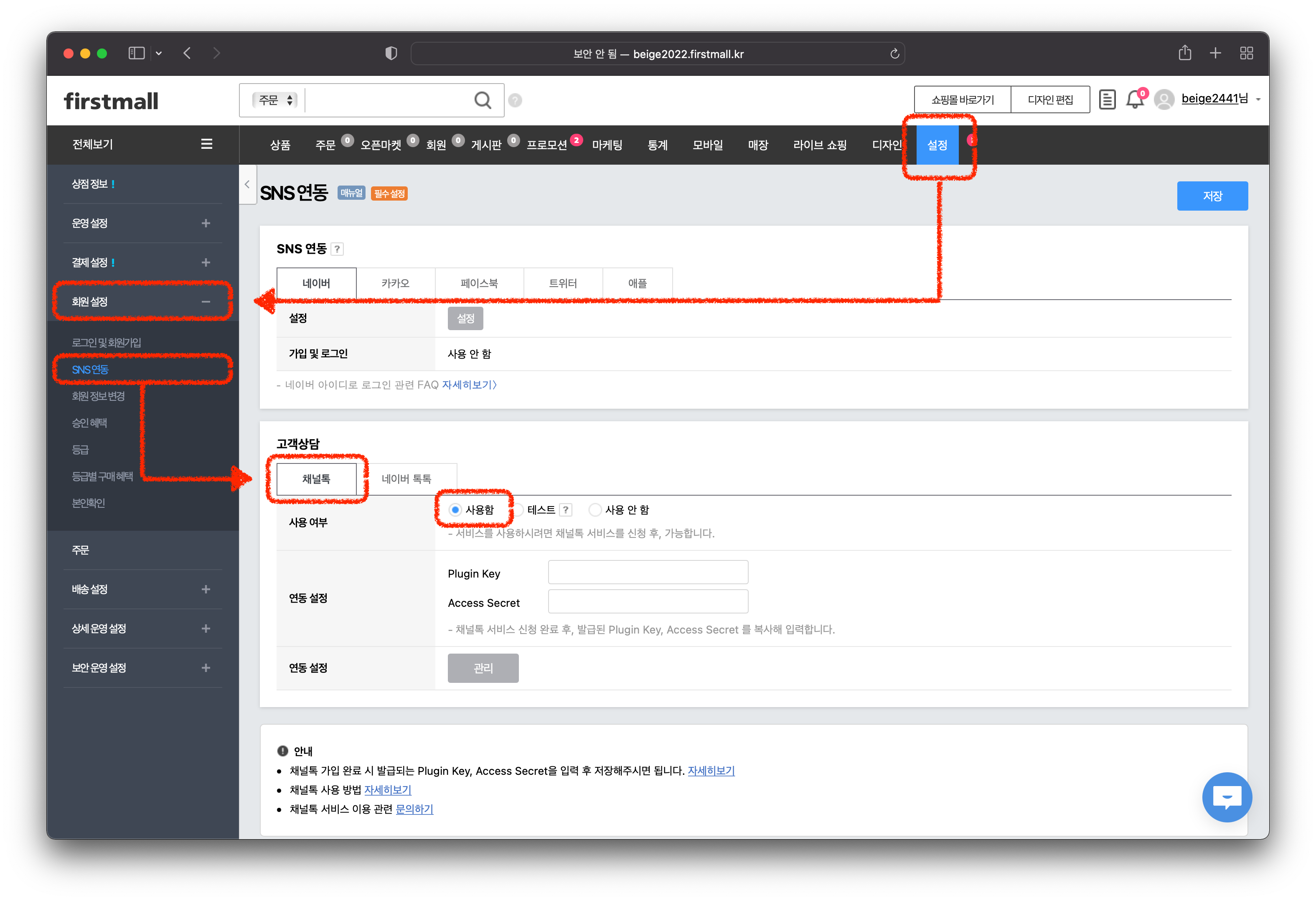 가비아 퍼스트몰 관리자 페이지에서 [설정] > [회원 설정] > [SNS 연동] 에 접속합니다. [고객상담] > [채널톡]에서 [사용함]으로 선택해주세요.