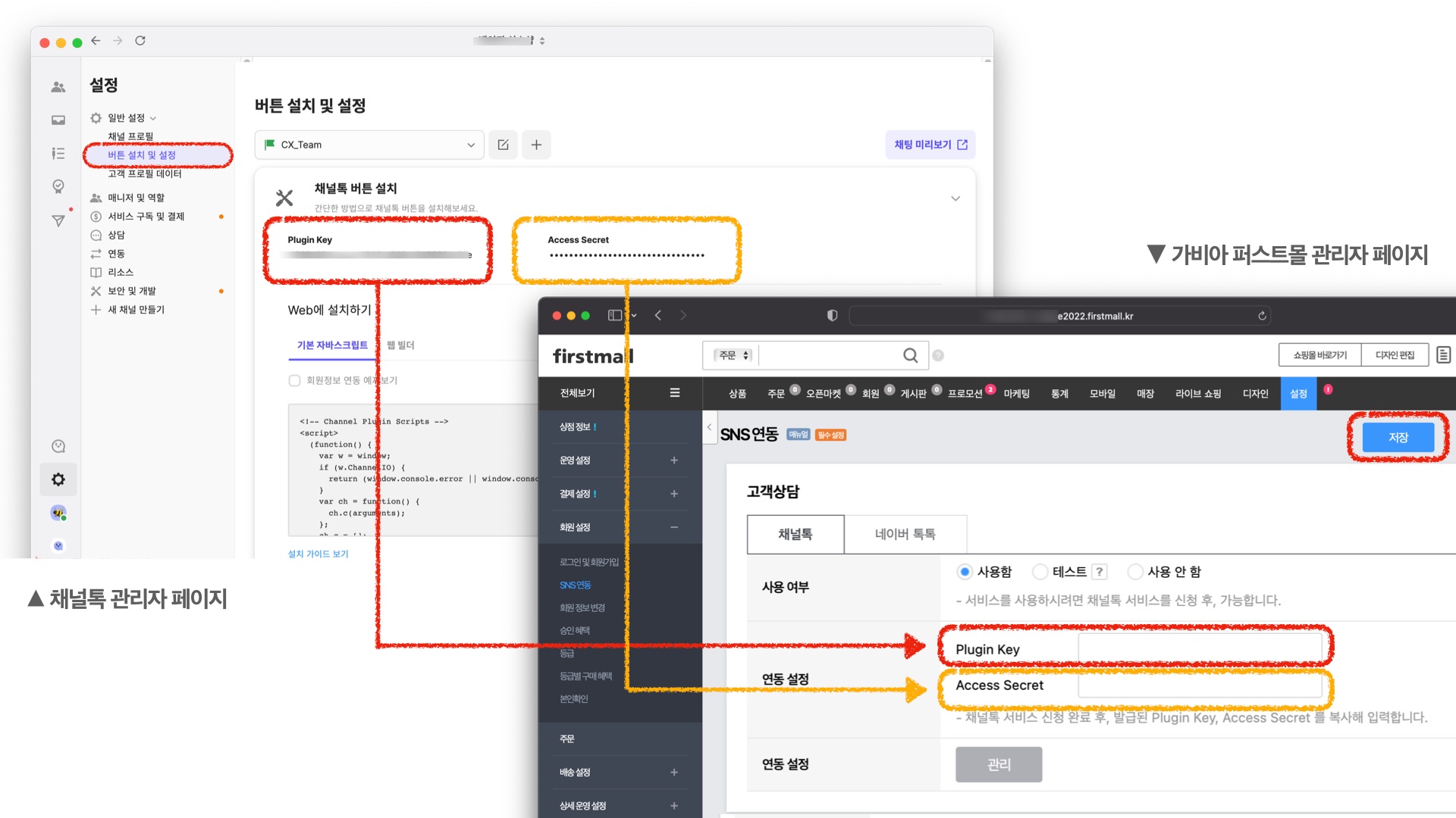 [연동 설정]에 내 채널의 Plugin Key와 Access Secret을 입력하고 저장합니다.