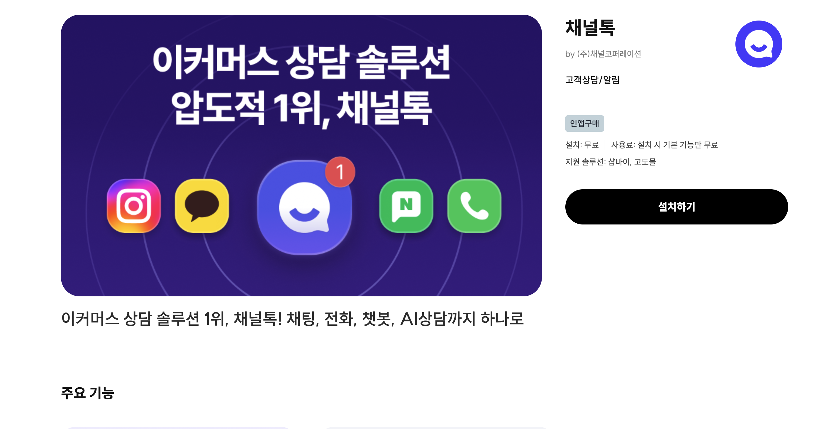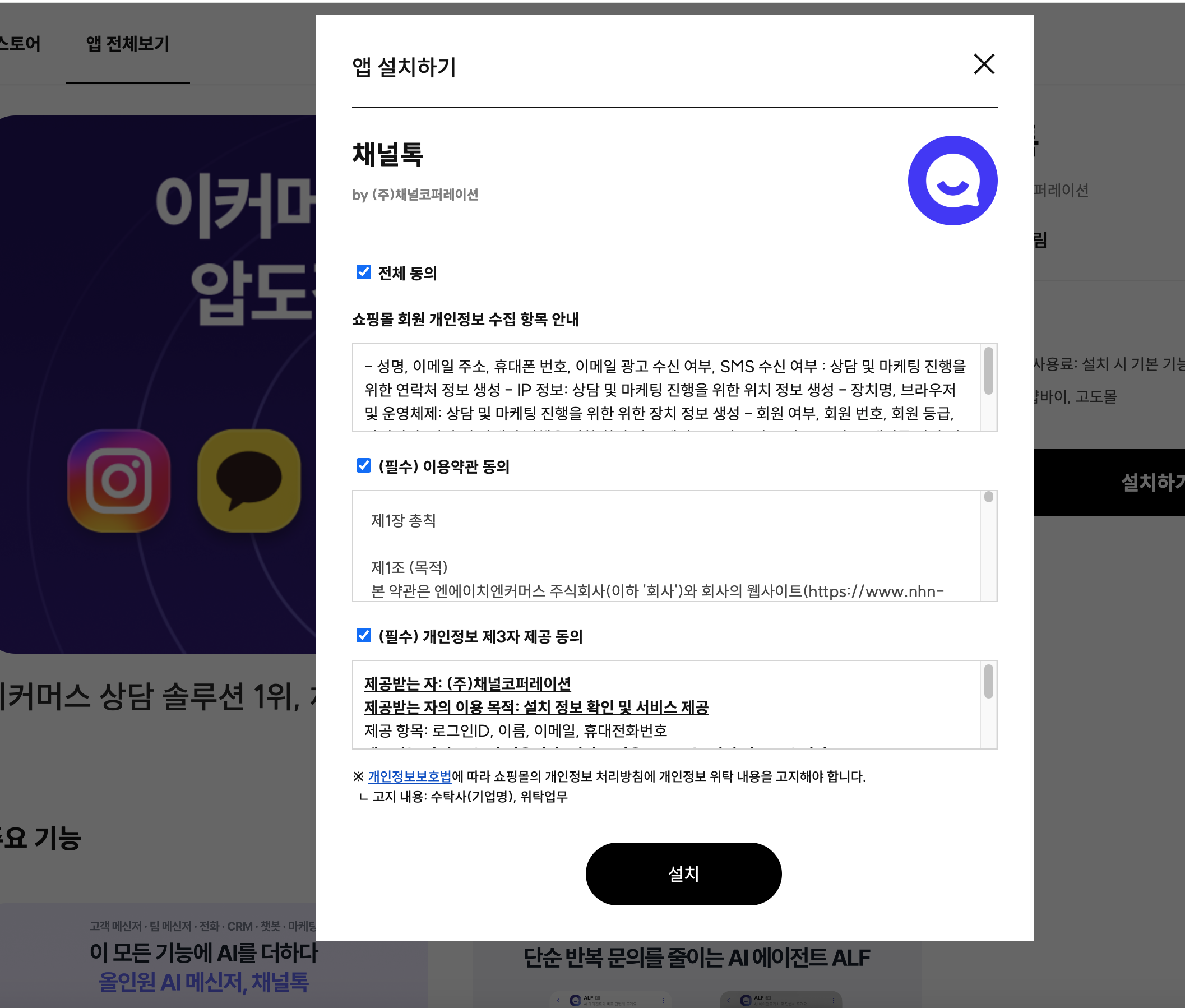 사용 권한 및 서비스 이용 약관 동의 화면에서 [동의 및 설치] 버튼을 클릭하면 채널톡 앱이 설치됩니다.
