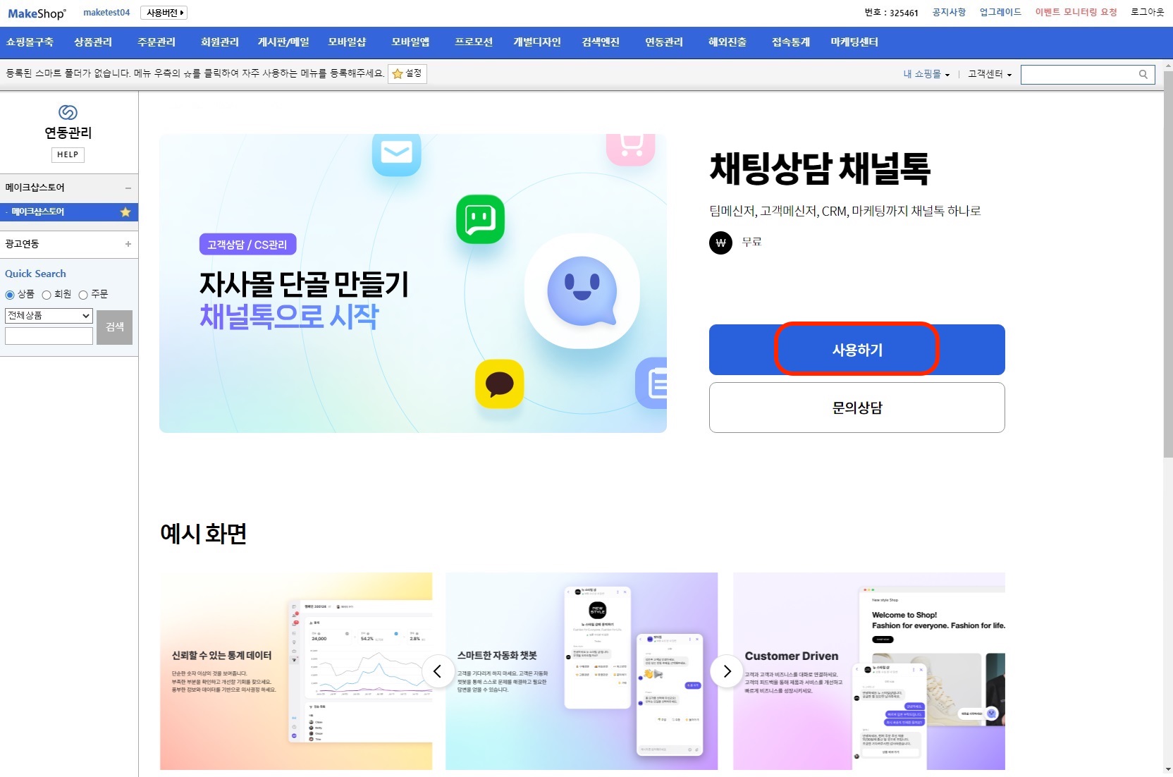 메이크샵 관리자 페이지 [연동관리] > [메이크샵스토어] > 채팅상담 채널톡 [자세히보기]를 클릭해주세요.