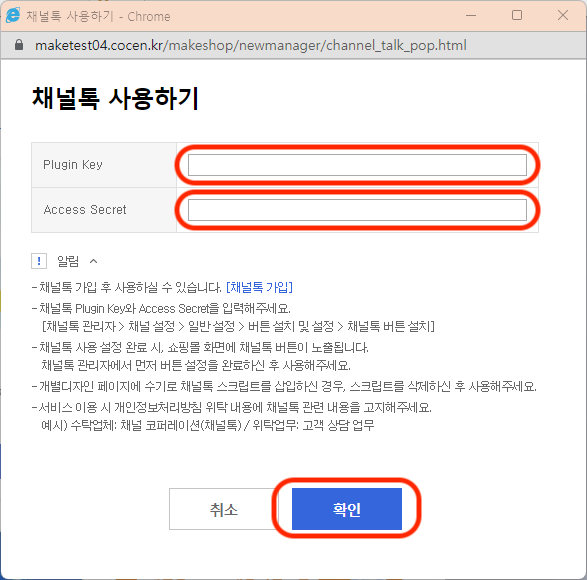 채널톡 사용하기 팝업에 채널톡 Plugin Key와 Access Secret을 입력후 [확인]