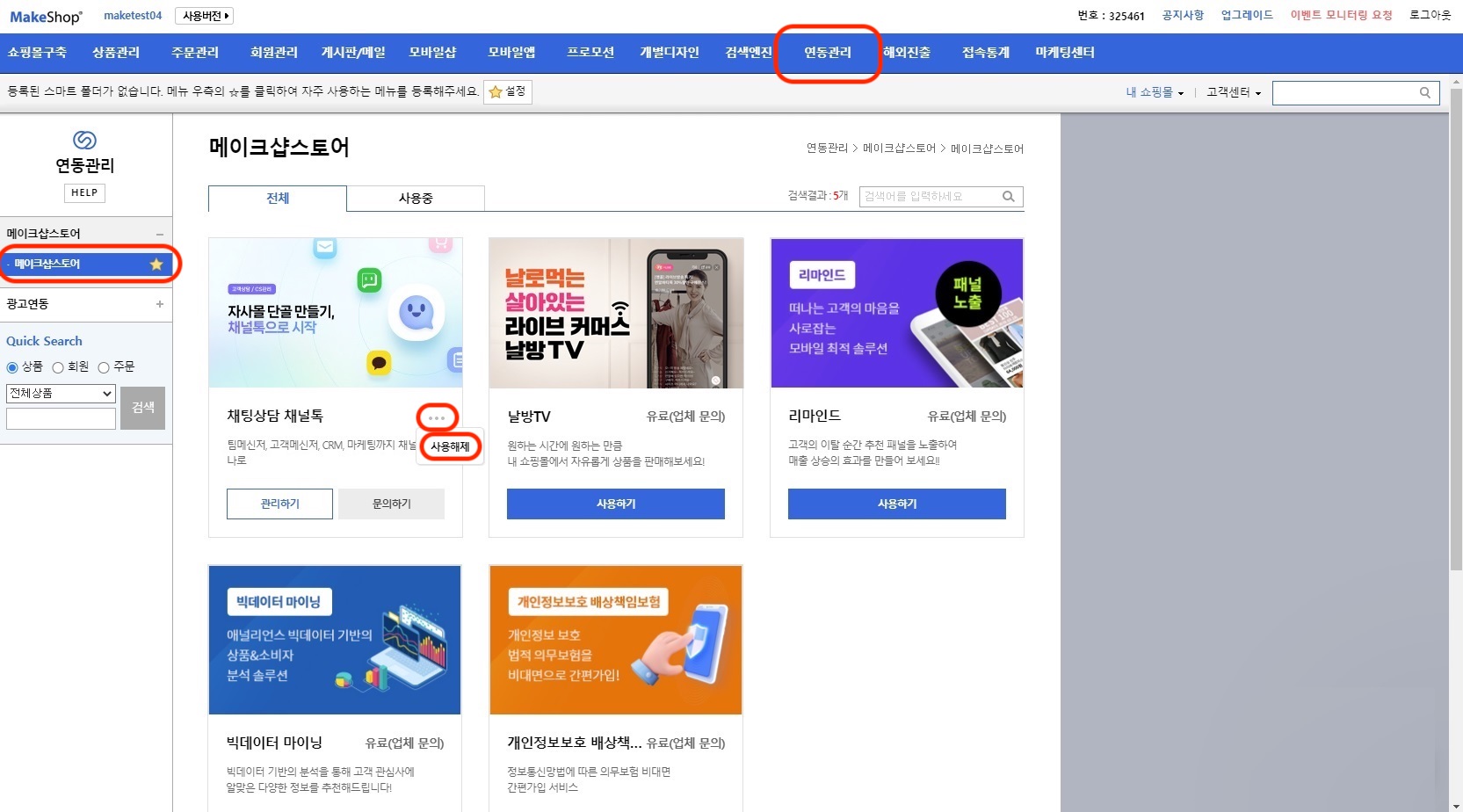 메이크샵 관리자 페이지 [연동관리] > [메이크샵스토어] > 채팅상담 채널톡 [...] > [사용해제]를 클릭해주세요.