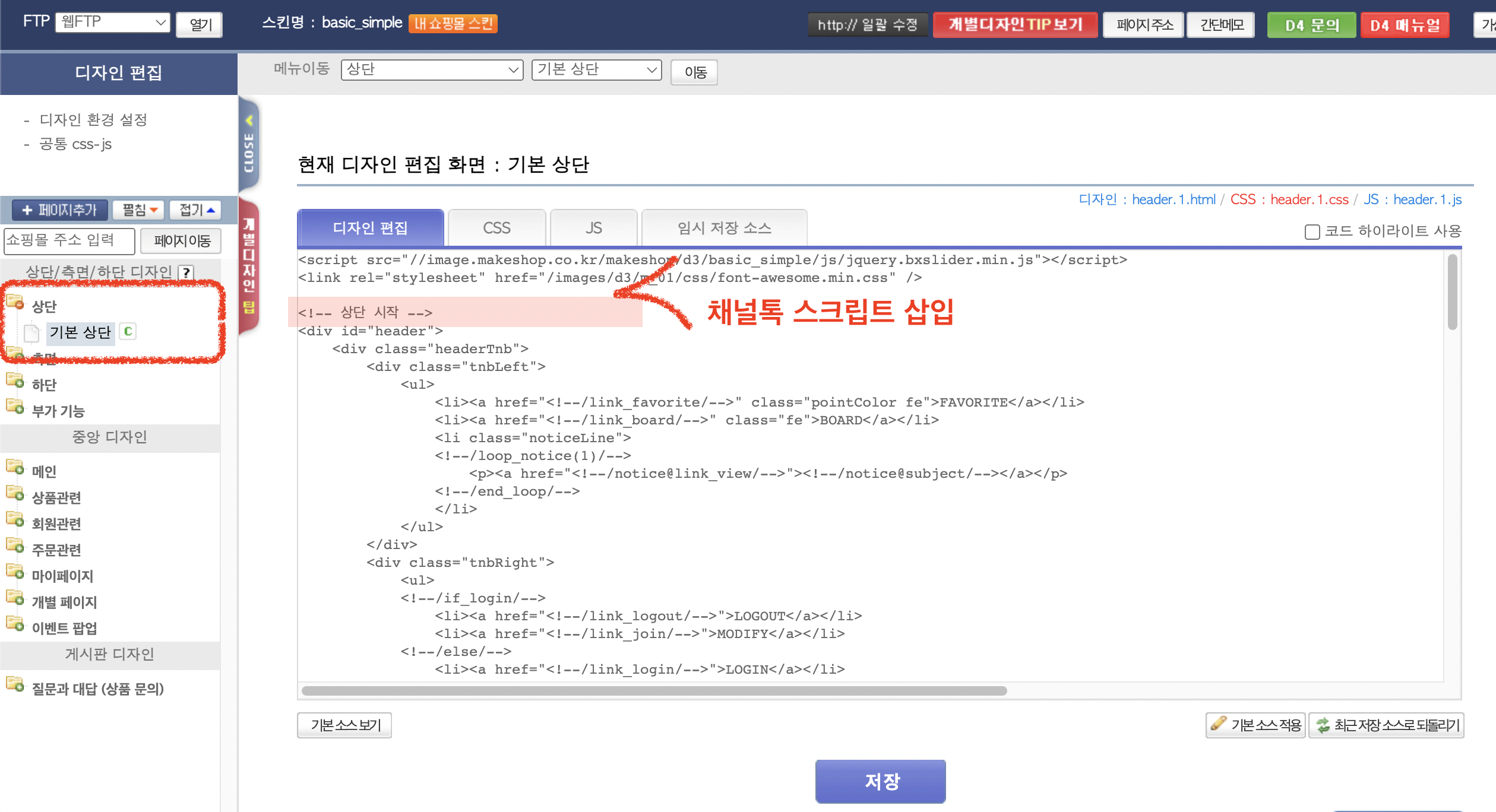 [상단] > [기본 상단] 편집 화면에서 <상단> 주석 위에 삽입했던 기존 채널톡 스크립트를 제거해주세요.