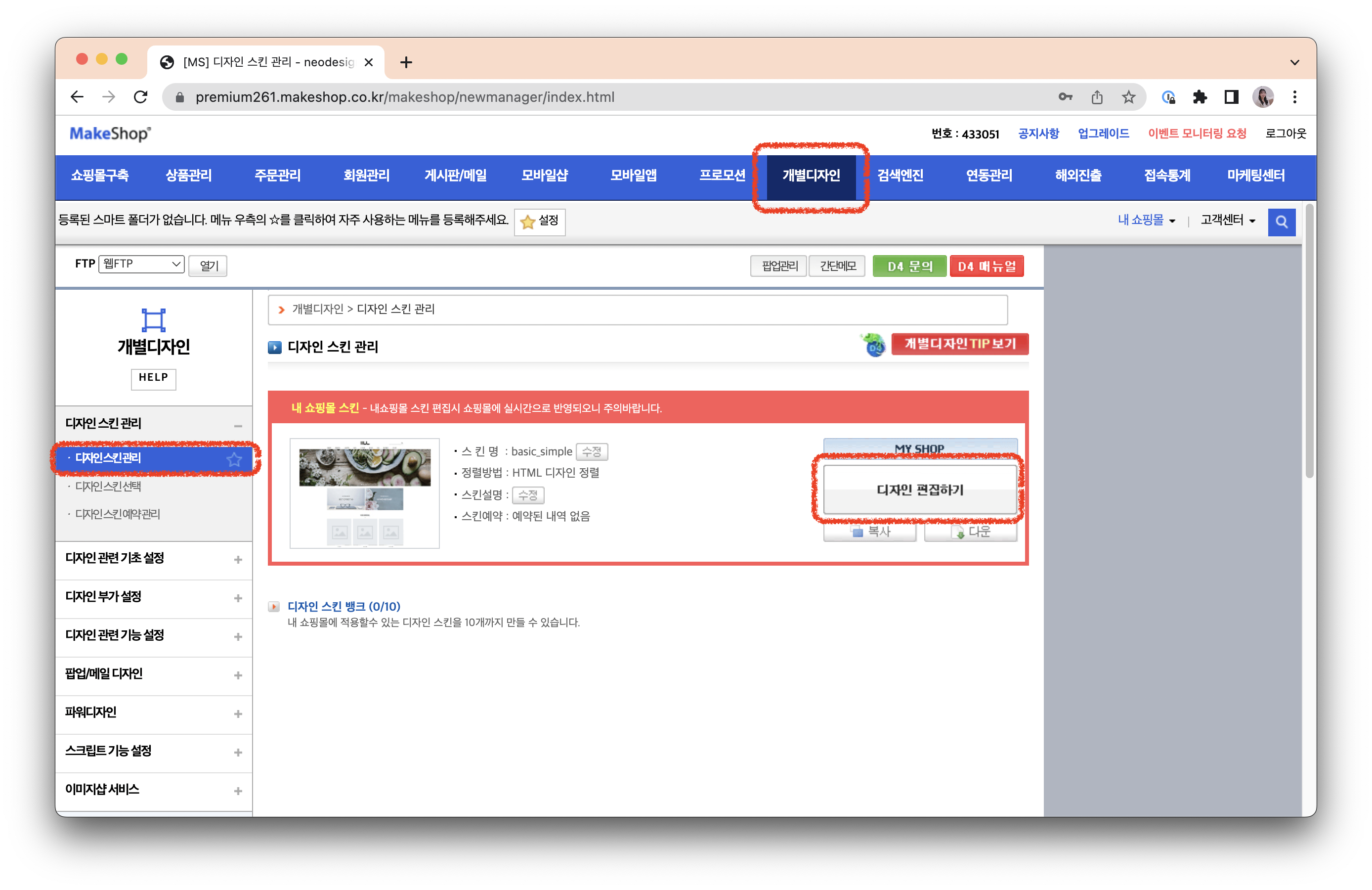 메이크샵 관리자 페이지 [개별디자인] > [디자인 스킨관리] > [디자인 편집하기]를 클릭해주세요.