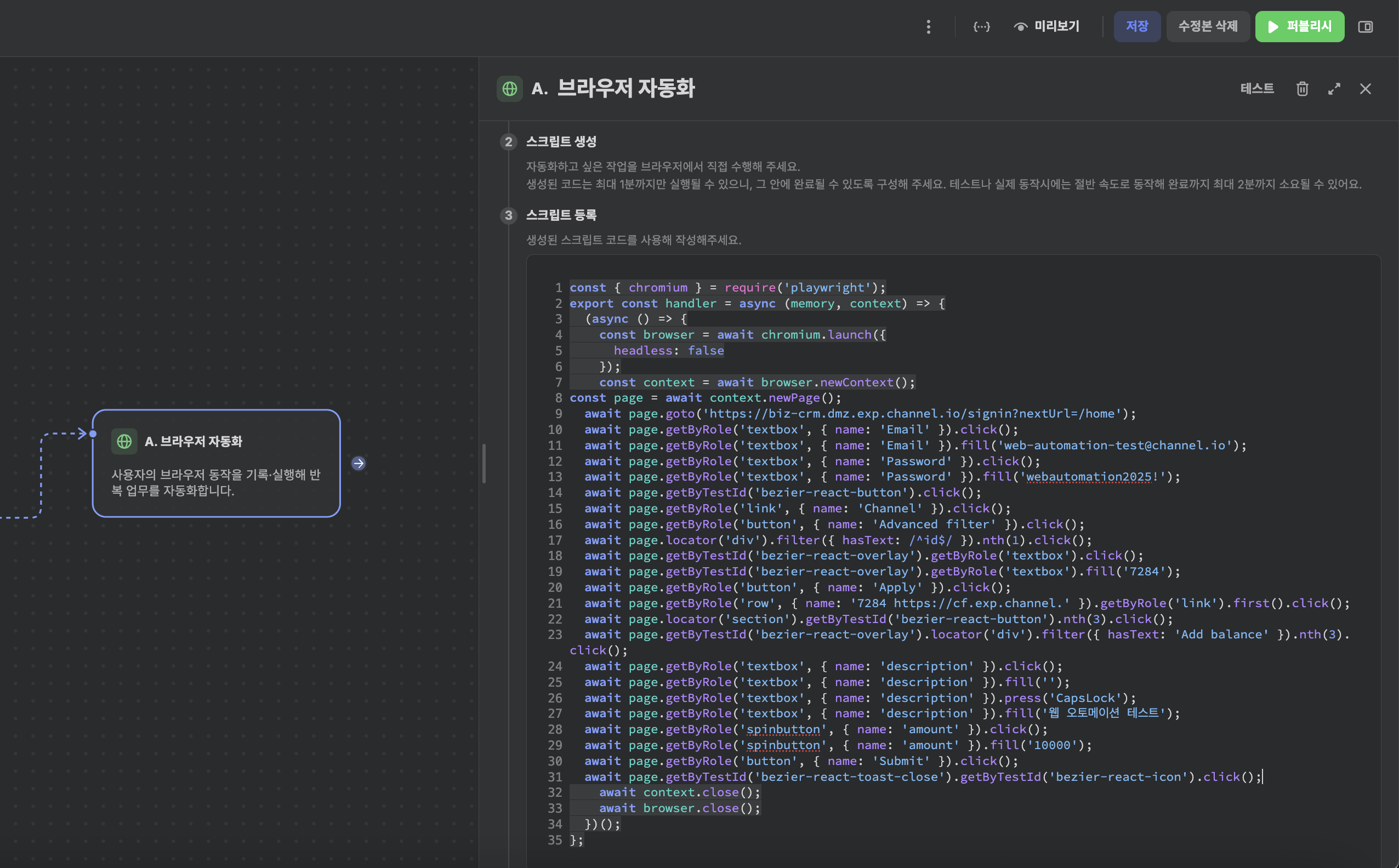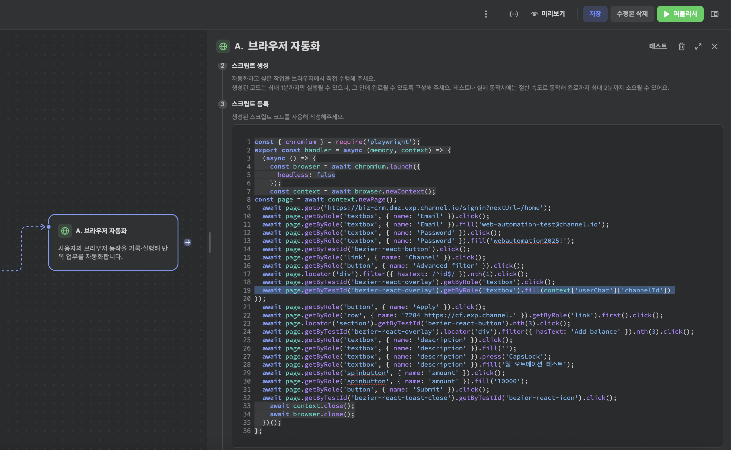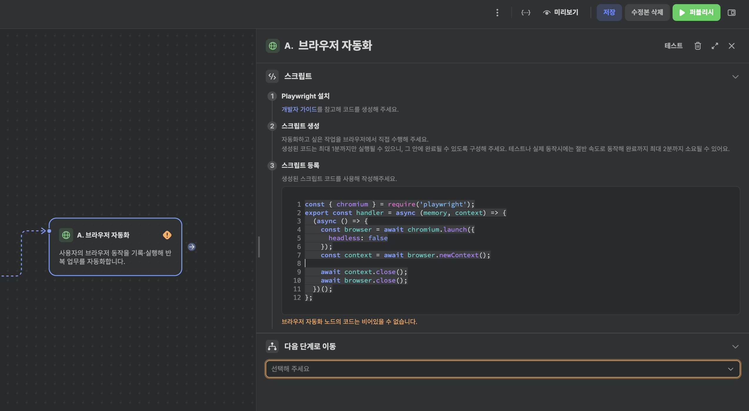 이후, newContext()와 context.close() 사이에 있는 코드들을 복사하여 브라우저 자동화 노드의 코드 템플릿에 복사해서 넣어주세요.