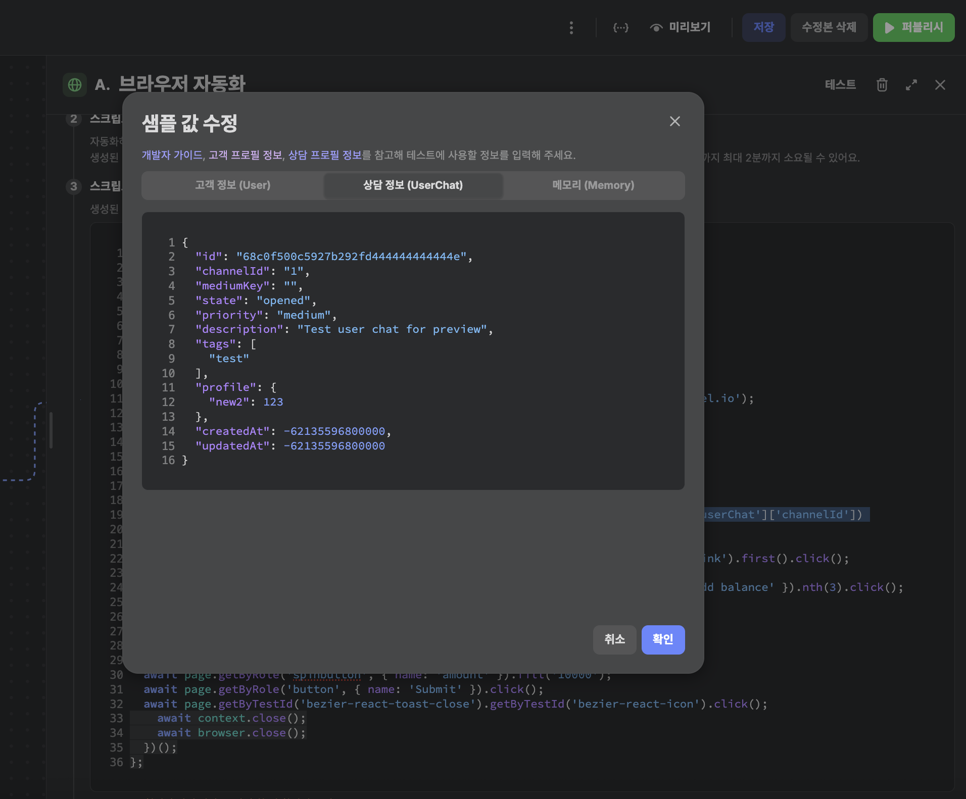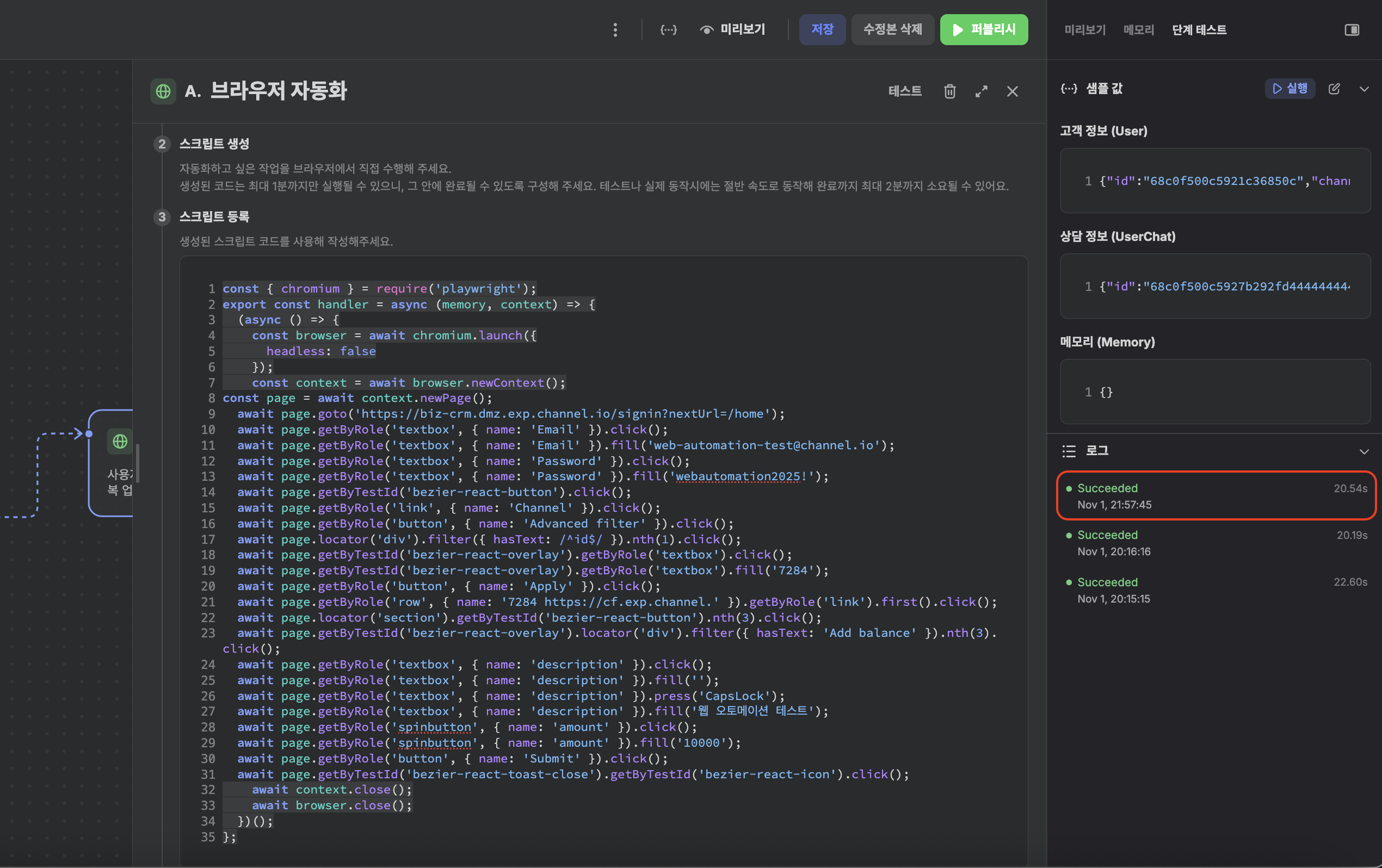 context['userChat']['channelId']를 이용하여 해당 값을 가져올 수 있습니다. 이렇게 memory 혹은 context를 이용하여 고객 정보와 브라우저 자동화 노드를 연동할 수 있습니다.