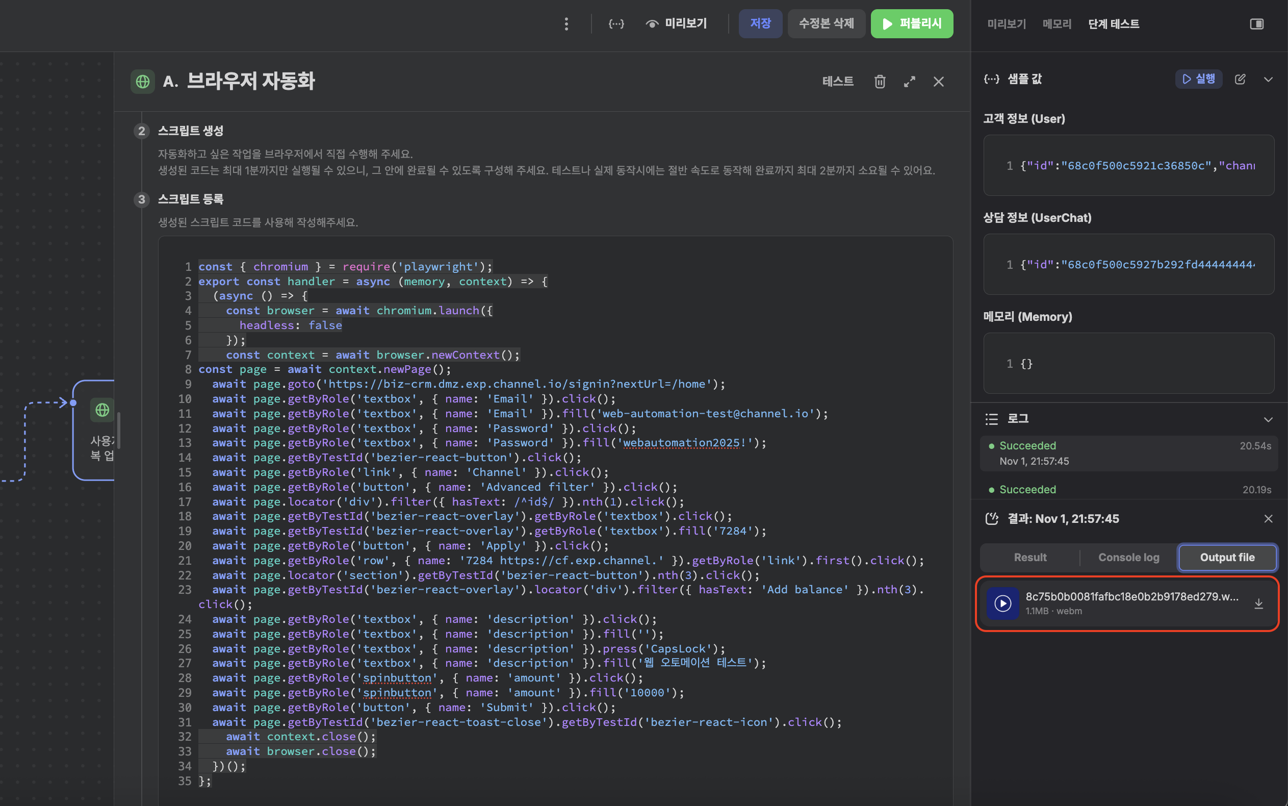 브라우저 실행 코드 작동 결과를 영상으로 받아볼 수 있습니다. 테스트 → 실행 → 로그 → Output file 를 차례로 클릭하여 다운 받아 주세요.