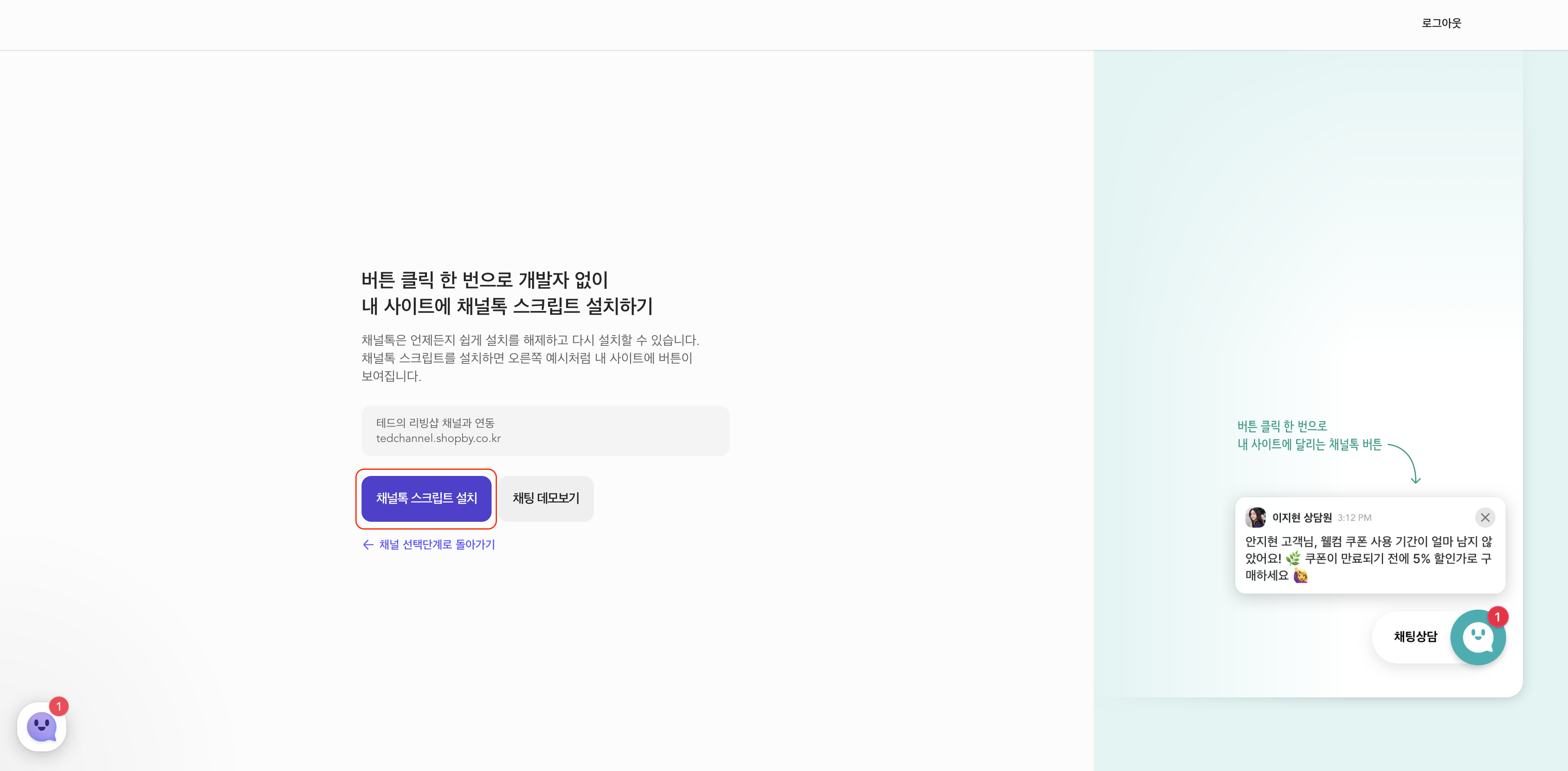 채널톡 스크립트 설치 버튼을 클릭하면 자동으로 설치됩니다.
