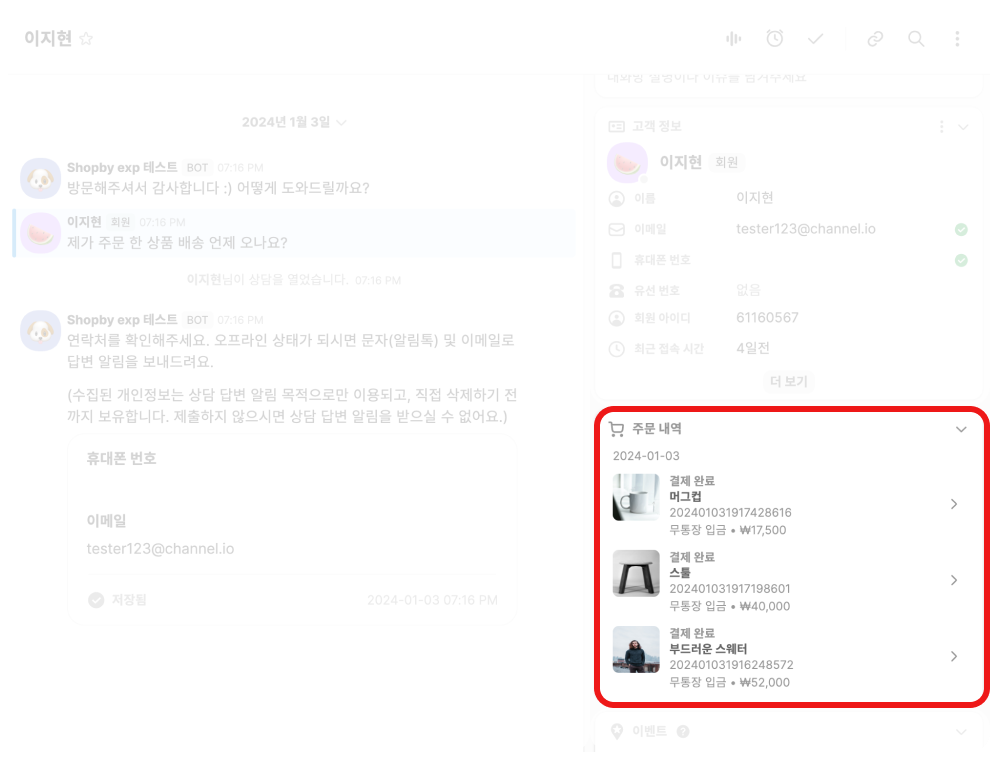 샵바이를 통해 채널톡을 설치하신 경우 자사몰 내의 회원 주문 내역이 상담할 때 확인 가능합니다.