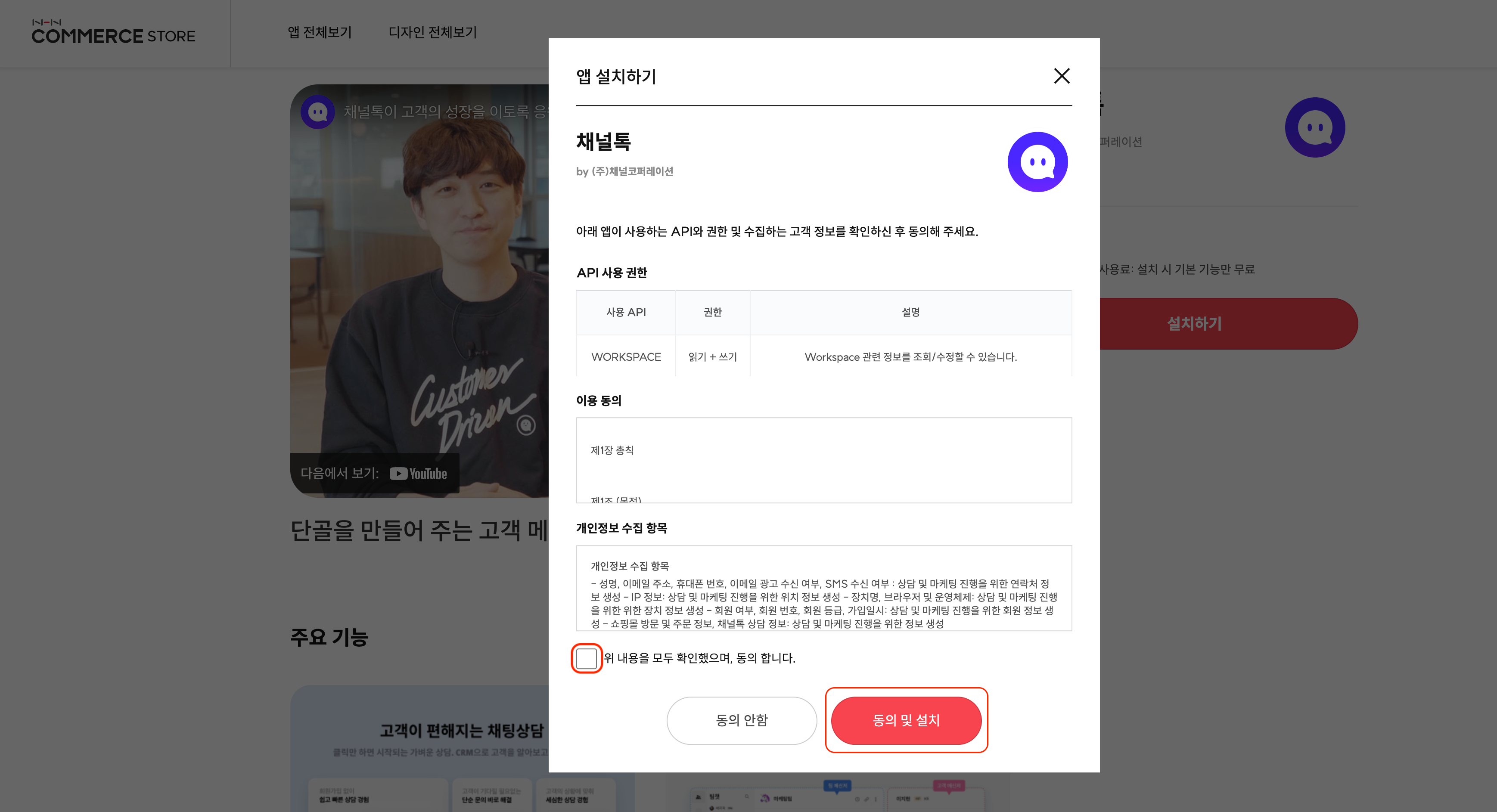 사용 권한 및 서비스 이용 약관 동의 화면에서 [동의 및 설치] 버튼을 클릭하면 채널톡 앱이 설치됩니다. 다음 단계인 앱 실행까지 진행하시면 연동이 완료됩니다.