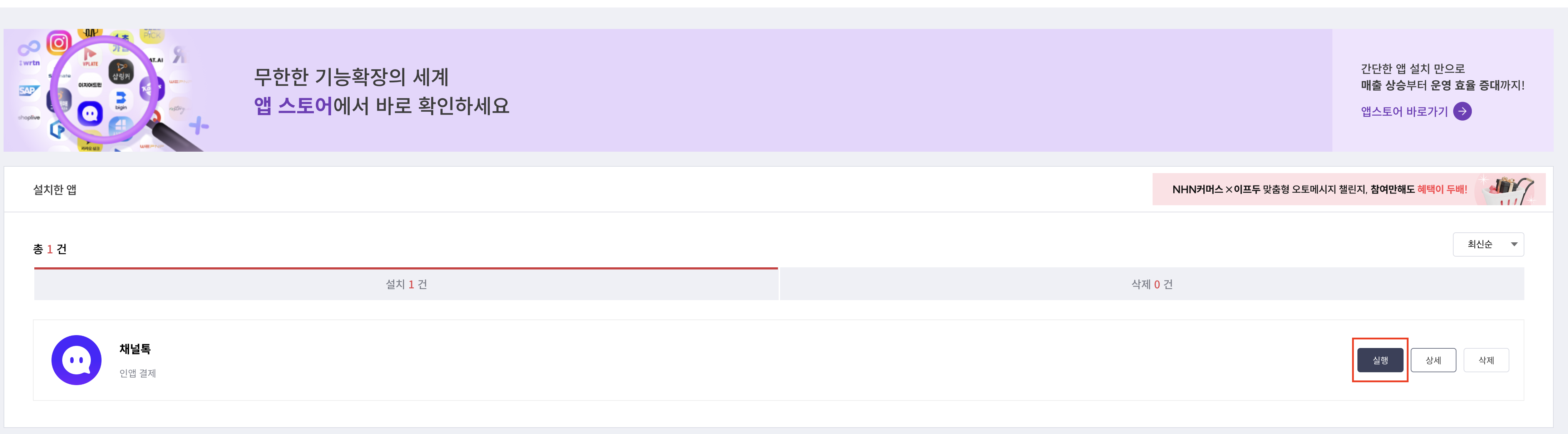 설치한 앱에서 [채널톡]을 찾아주시고 [실행] 버튼을 눌러주세요.
