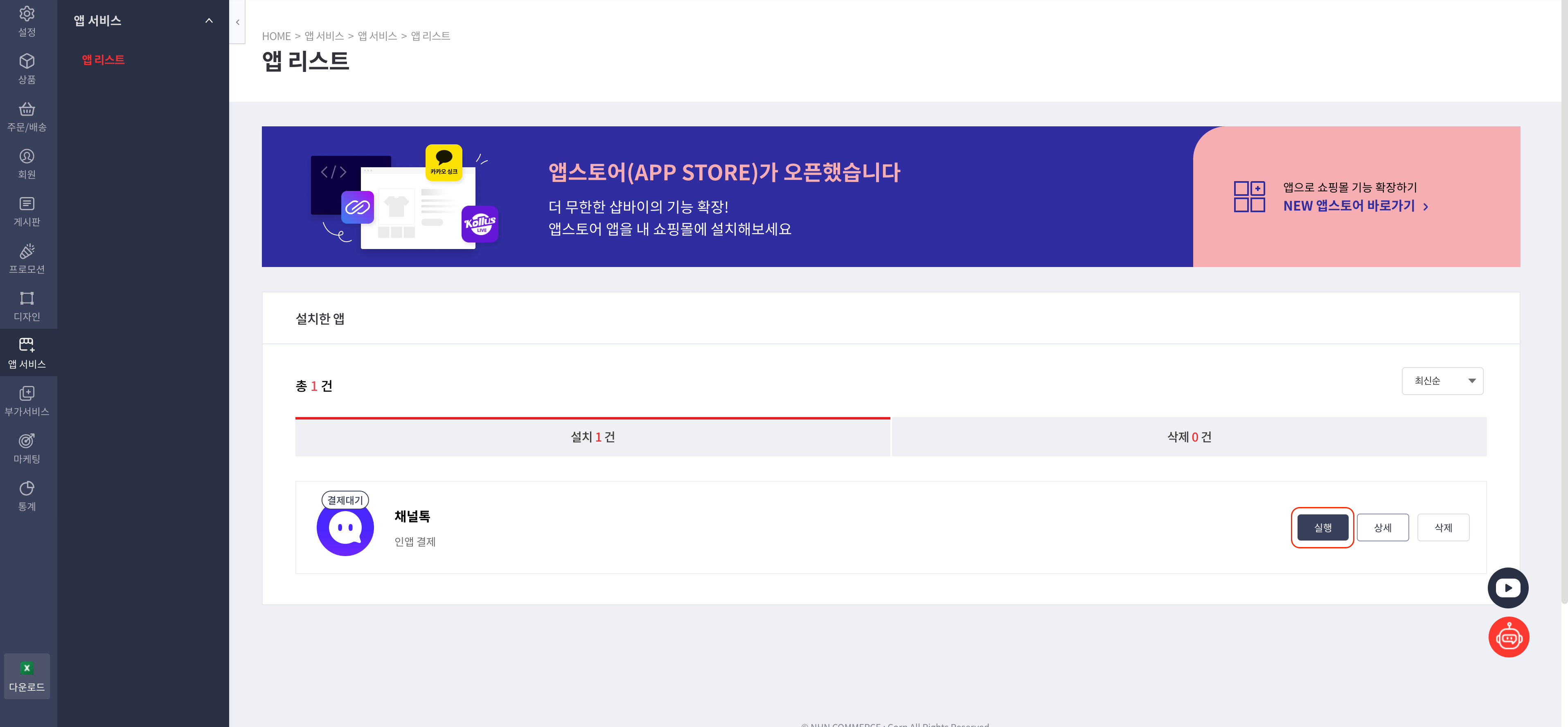 쇼핑몰 관리자 어드민 > 앱 서비스 > 앱 리스트 에서 채널톡 앱의 [실행 버튼을 클릭하면 채널톡 연동을 시작합니다. [연동 시작하기]를 눌러 순차적으로 진행해주세요.