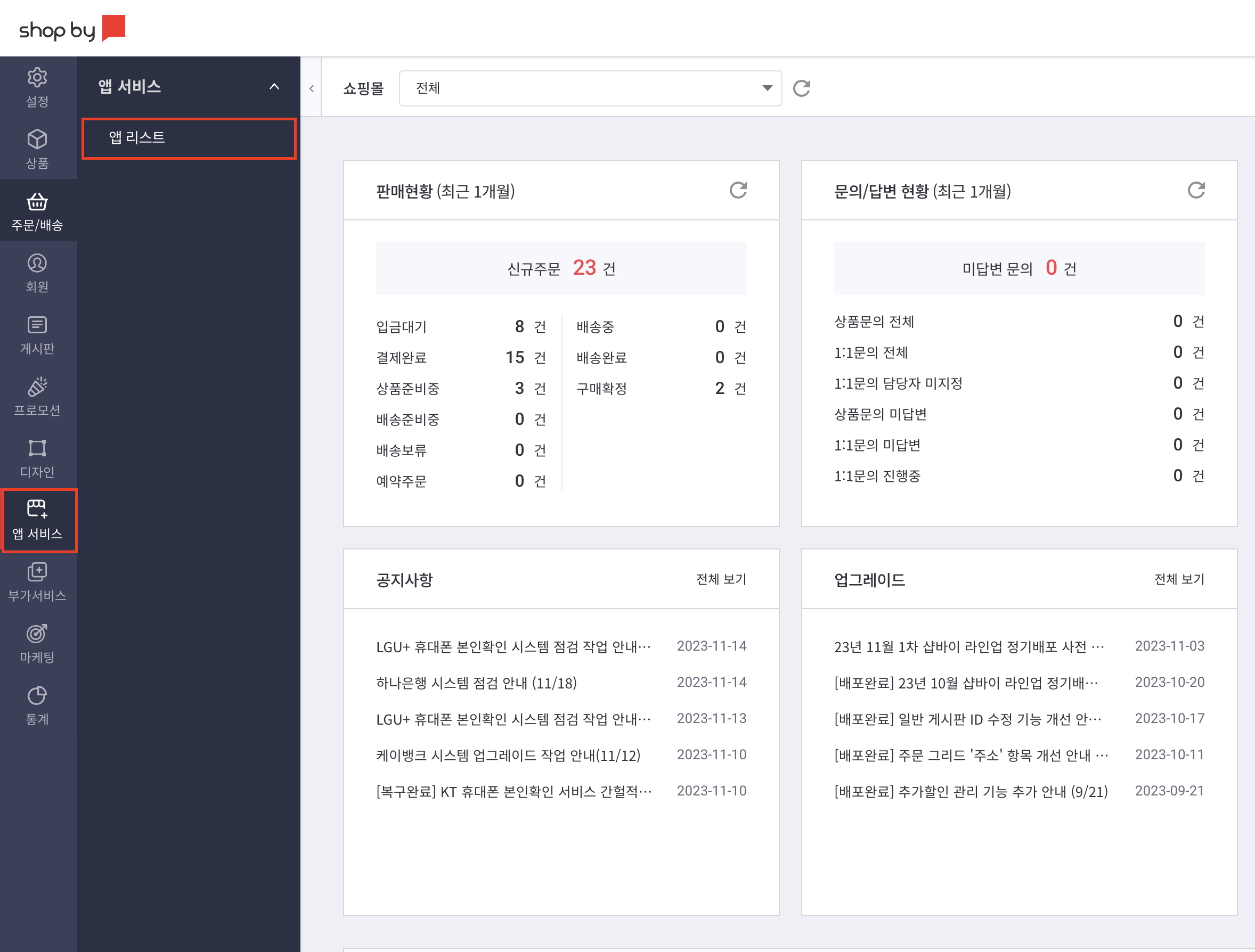 샵바이 관리자 페이지에서 [앱 서비스] -> [앱 리스트]를 눌러주세요.