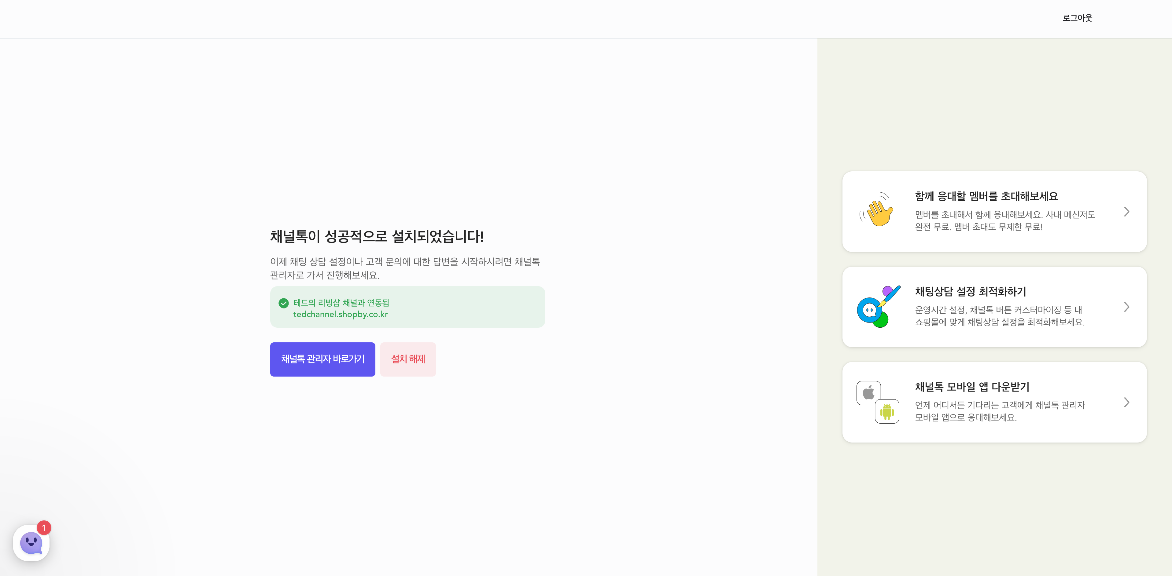 채널톡 설치가 완료되었습니다! 웹사이트 우측 하단에 채널톡 버튼이 생성된 것을 확인해주세요. 이제 채널톡 관리자로 이동하여 채널 설정을 완료하고 고객과 상담을 시작할 수 있습니다.