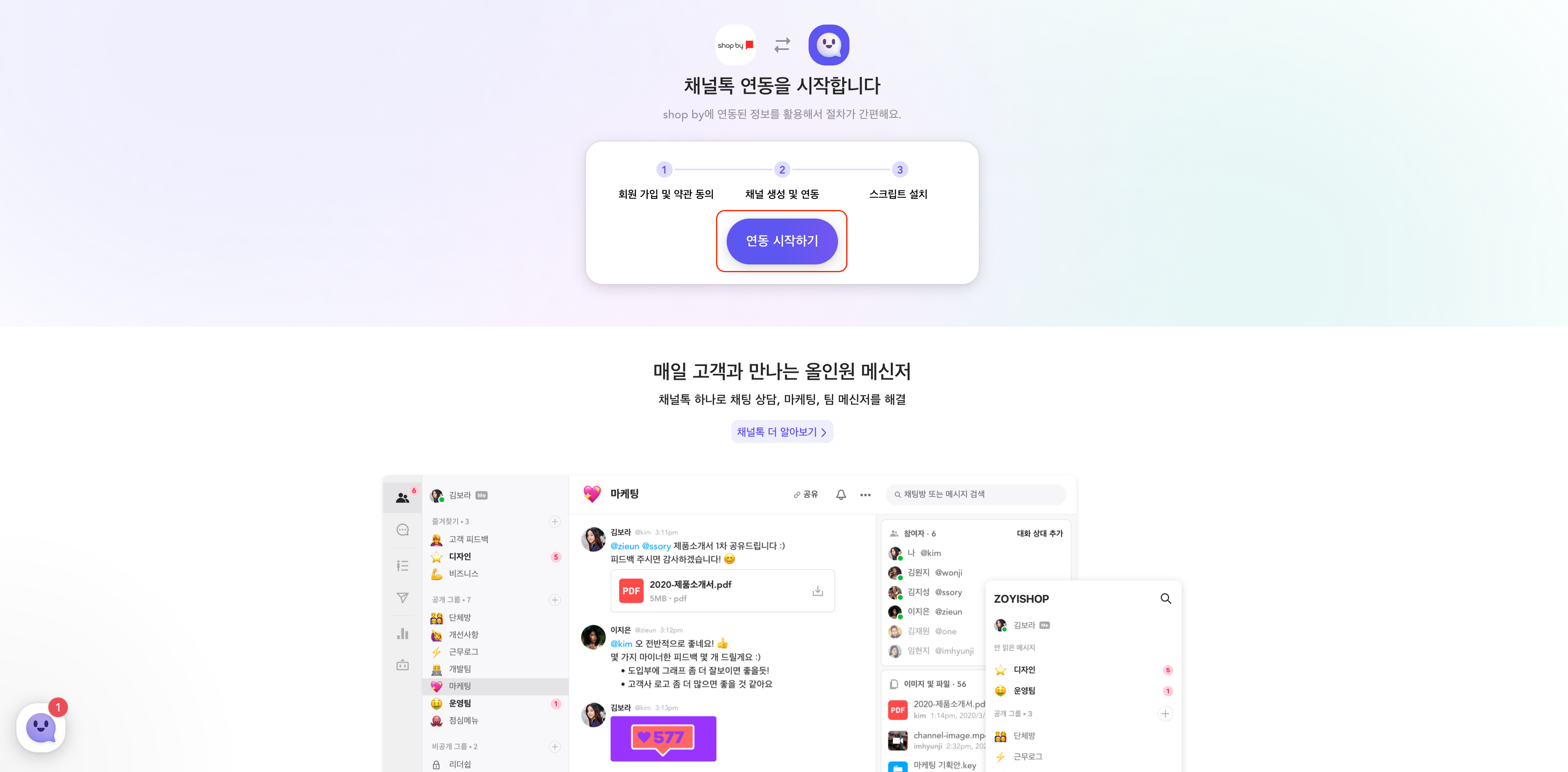 샵바이는 채널톡 공식 빌더사로, 클릭 몇 번만으로 3분 안에 설치가 가능합니다.