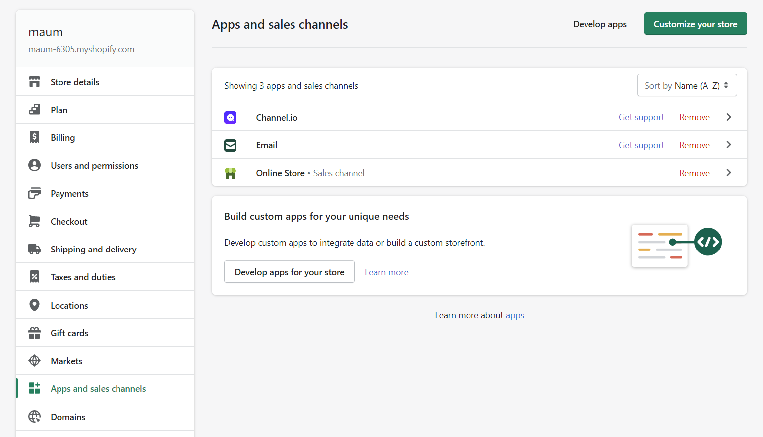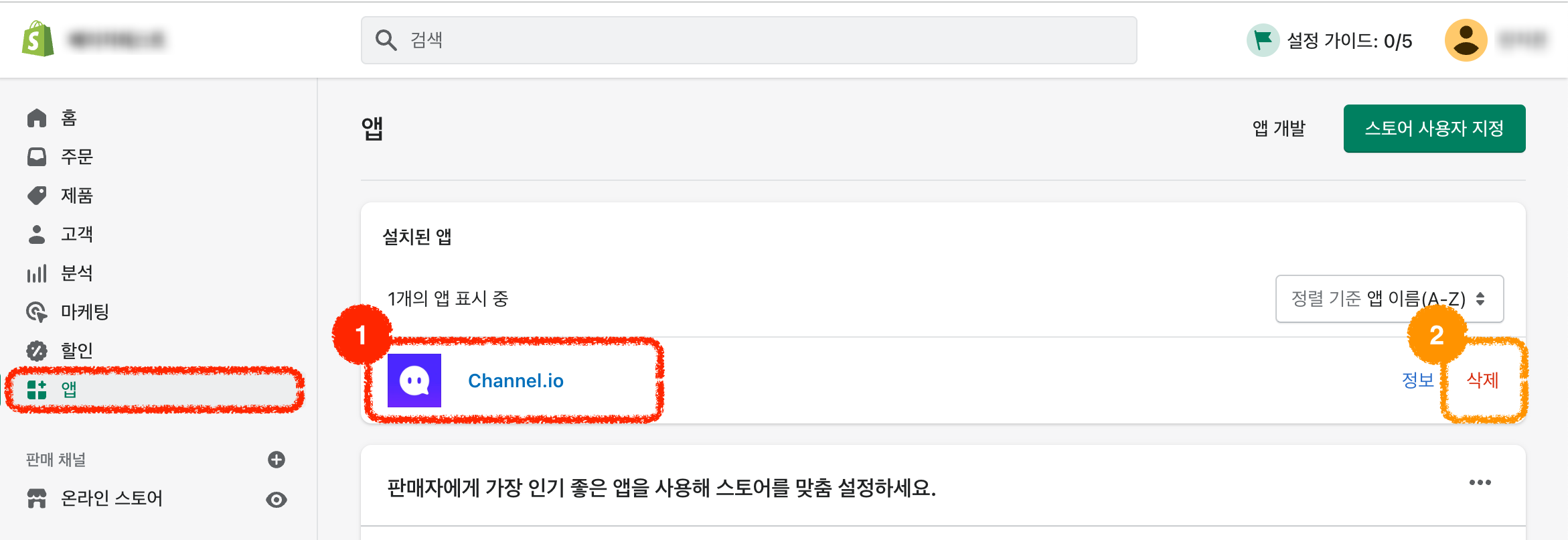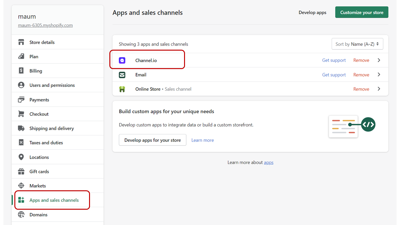 쇼피파이 admin page → settings → apps and sales channels → channel.io 를 클릭해 주세요.