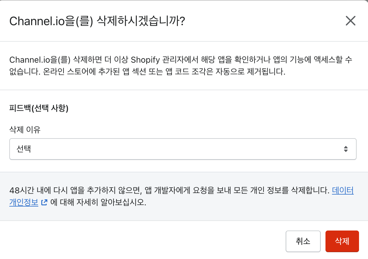 쇼피파이 관리자 페이지의 [앱] > [설치된 앱] > [Channel.io] 를 클릭합니다. 바로 연결되는 채널톡 페이지에서 [설치 해제]를 눌러 진행해주세요. 설치를 해제해도 채널에서의 기존 상담 내역은 삭제되지 않습니다.
