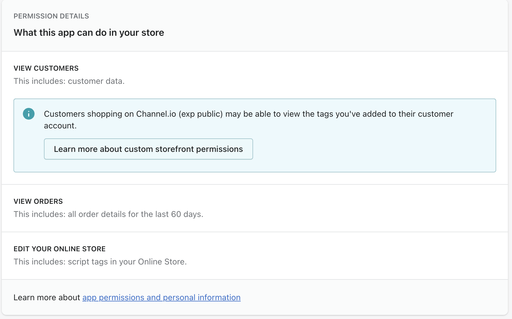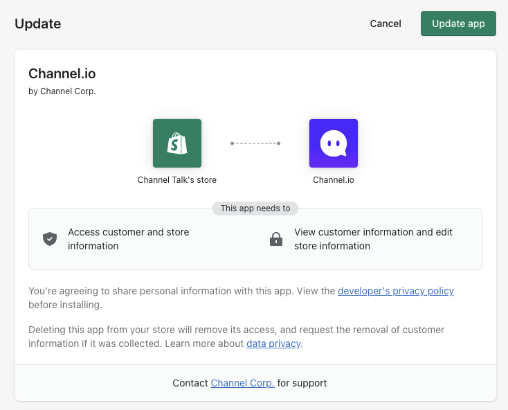 2022년 9월 28일 이전부터 쇼피파이에서 채널톡 앱을 설치해 사용하셨다면, 권한 업데이트를 진행했는지 확인해 주세요. 원활한 채널톡 이용을 위해 추가 권한 허용이 필요합니다.