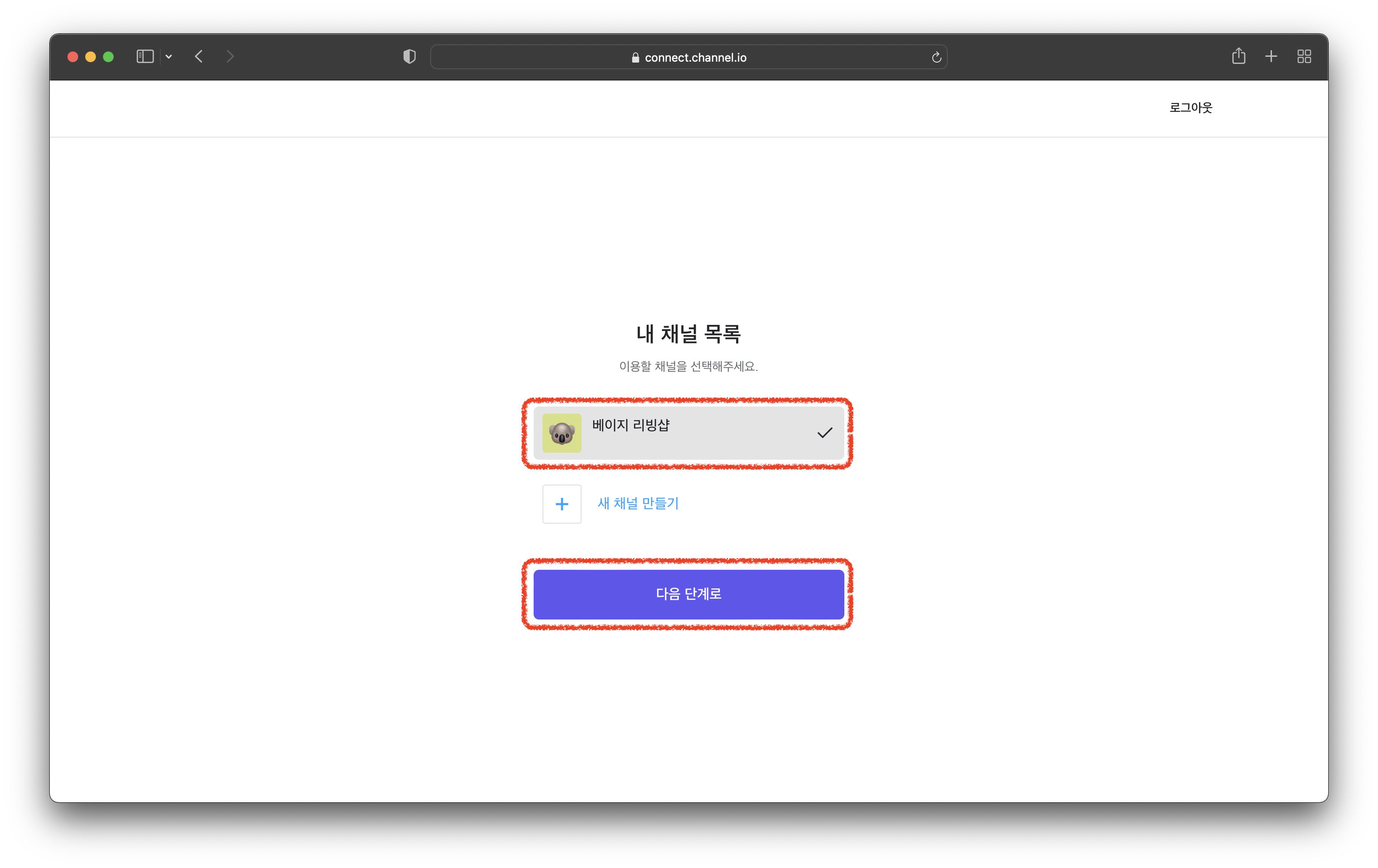 내 채널 목록에서 연결할 채널을 선택해주세요. 만약 내 채널이 여러개라면 사이트와 연동할 1개의 채널을 선택해주세요.