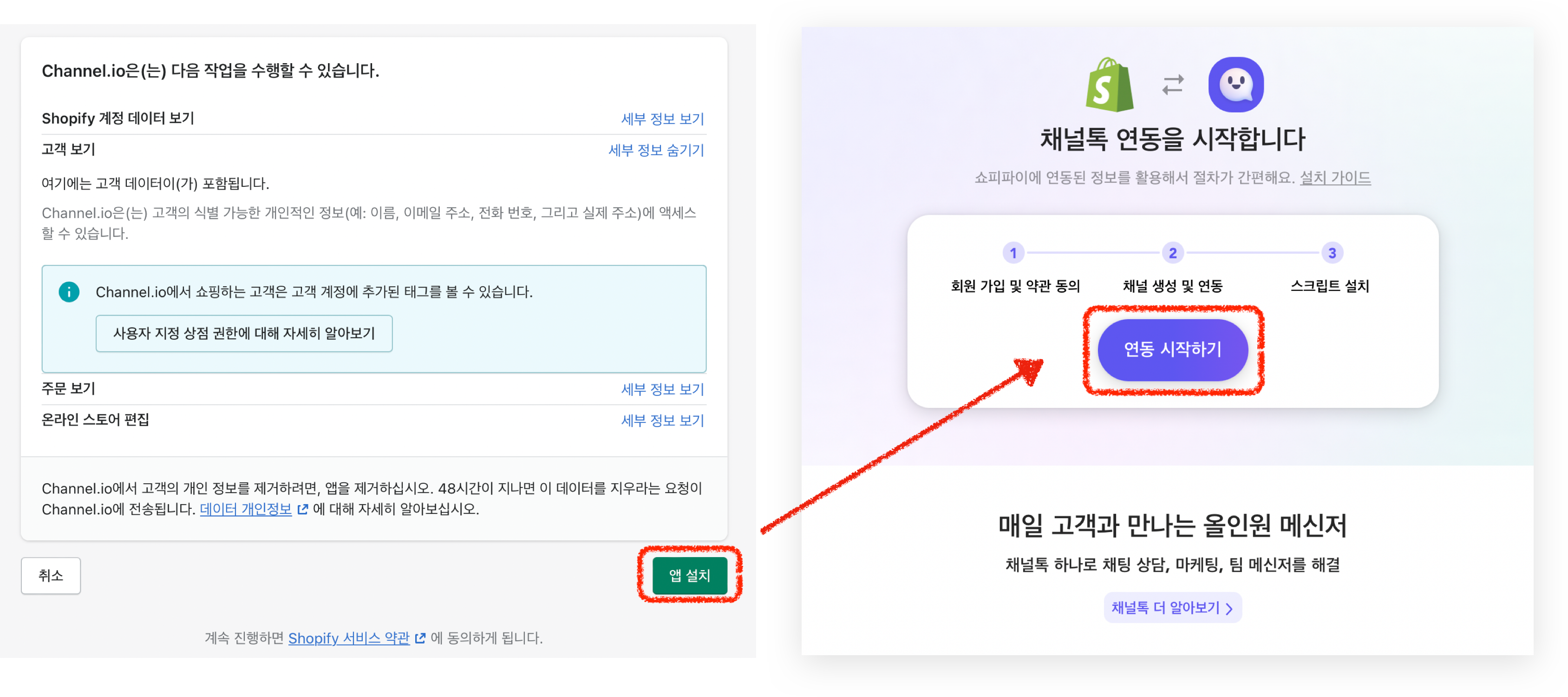 접근 권한 동의 화면에서 [앱 설치]을 클릭하면 채널톡 연동을 시작합니다. [연동 시작하기]를 눌러 순차적으로 진행해주세요.