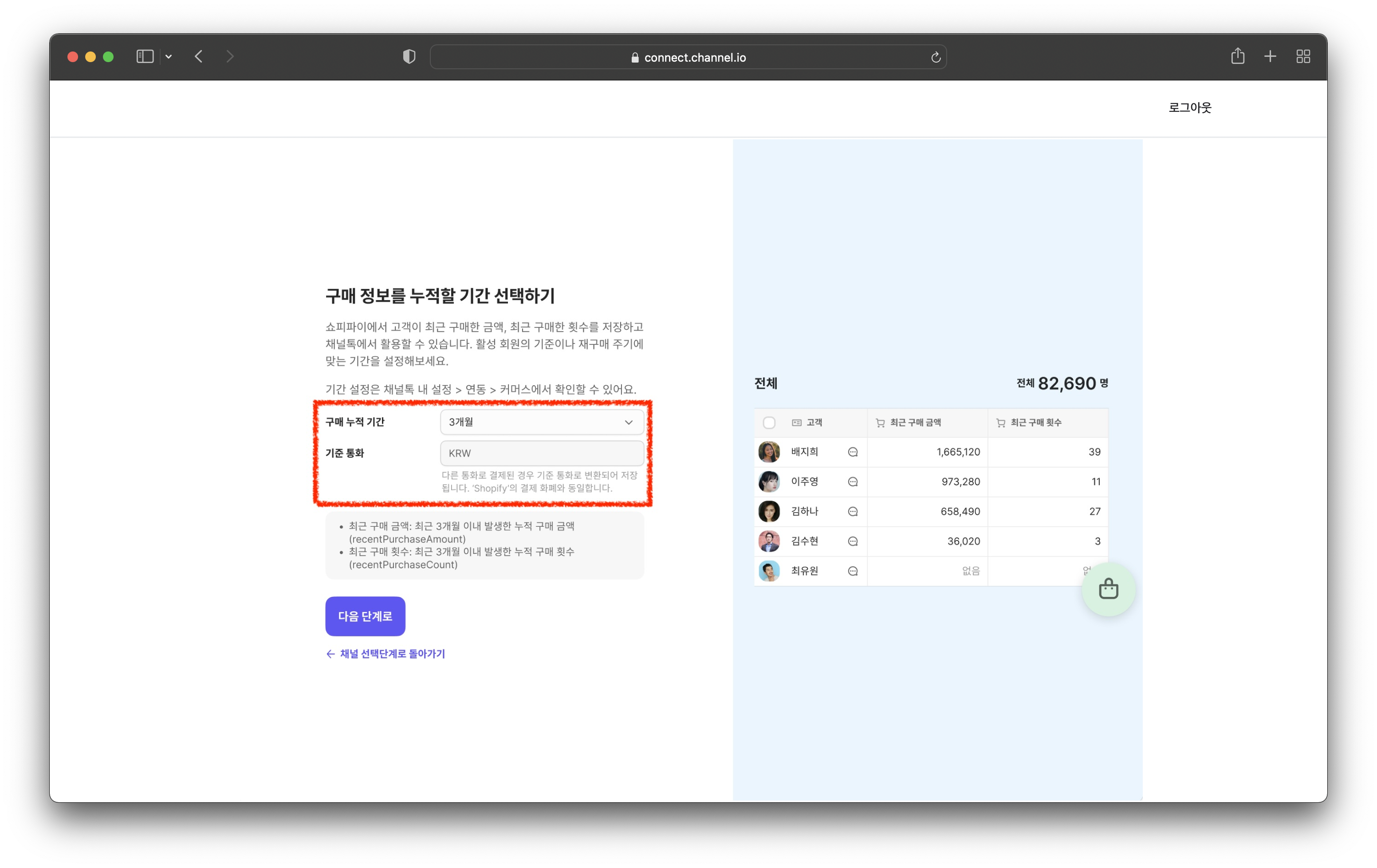 고객 연락처에서 확인하실 최근 구매 금액, 최근 구매 횟수에 대한 구매 정보 누적 기간을 설정해주세요.