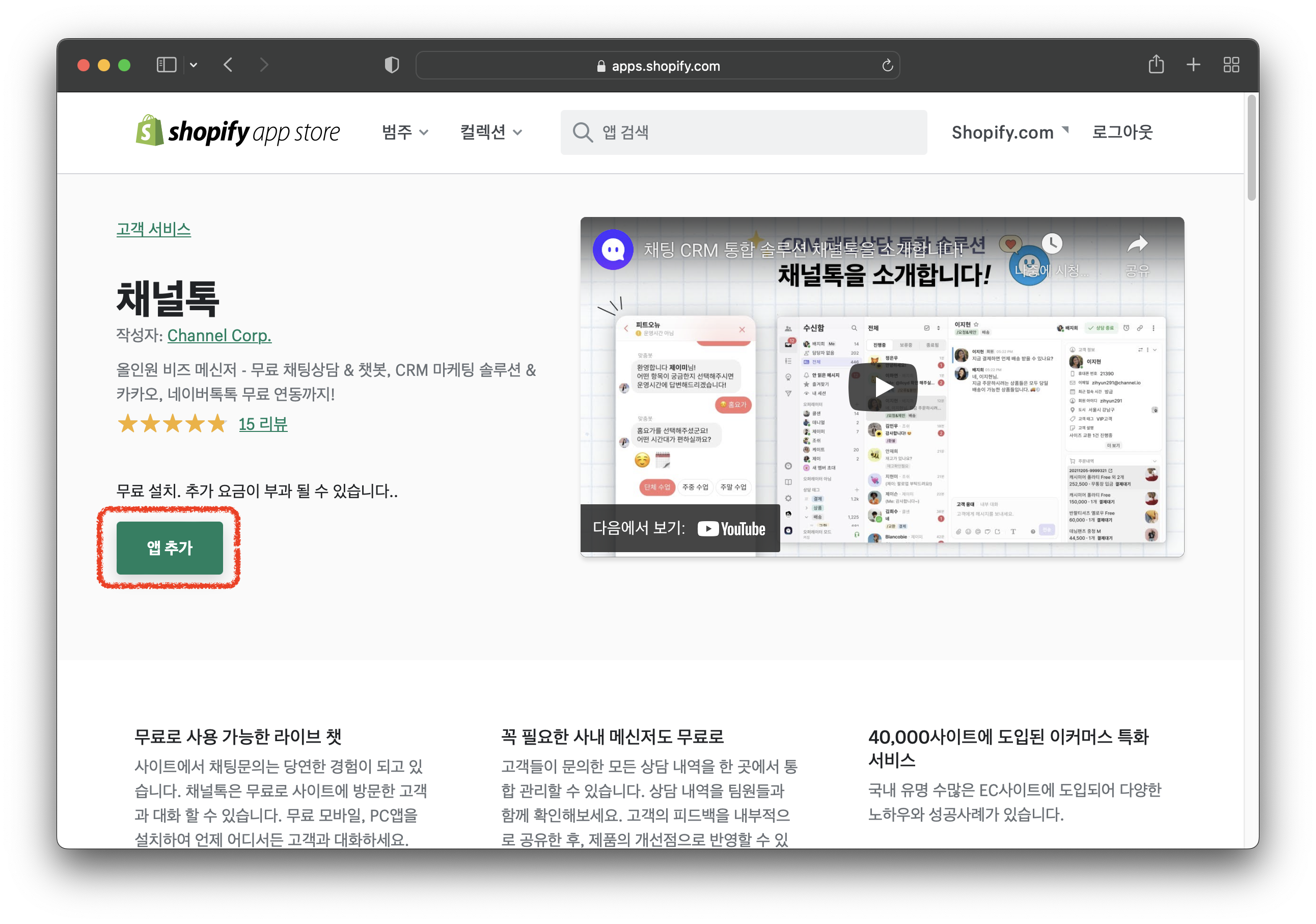 쇼피파이는 채널톡 공식 빌더사로, 클릭 몇 번만으로 3분 안에 설치가 가능합니다.