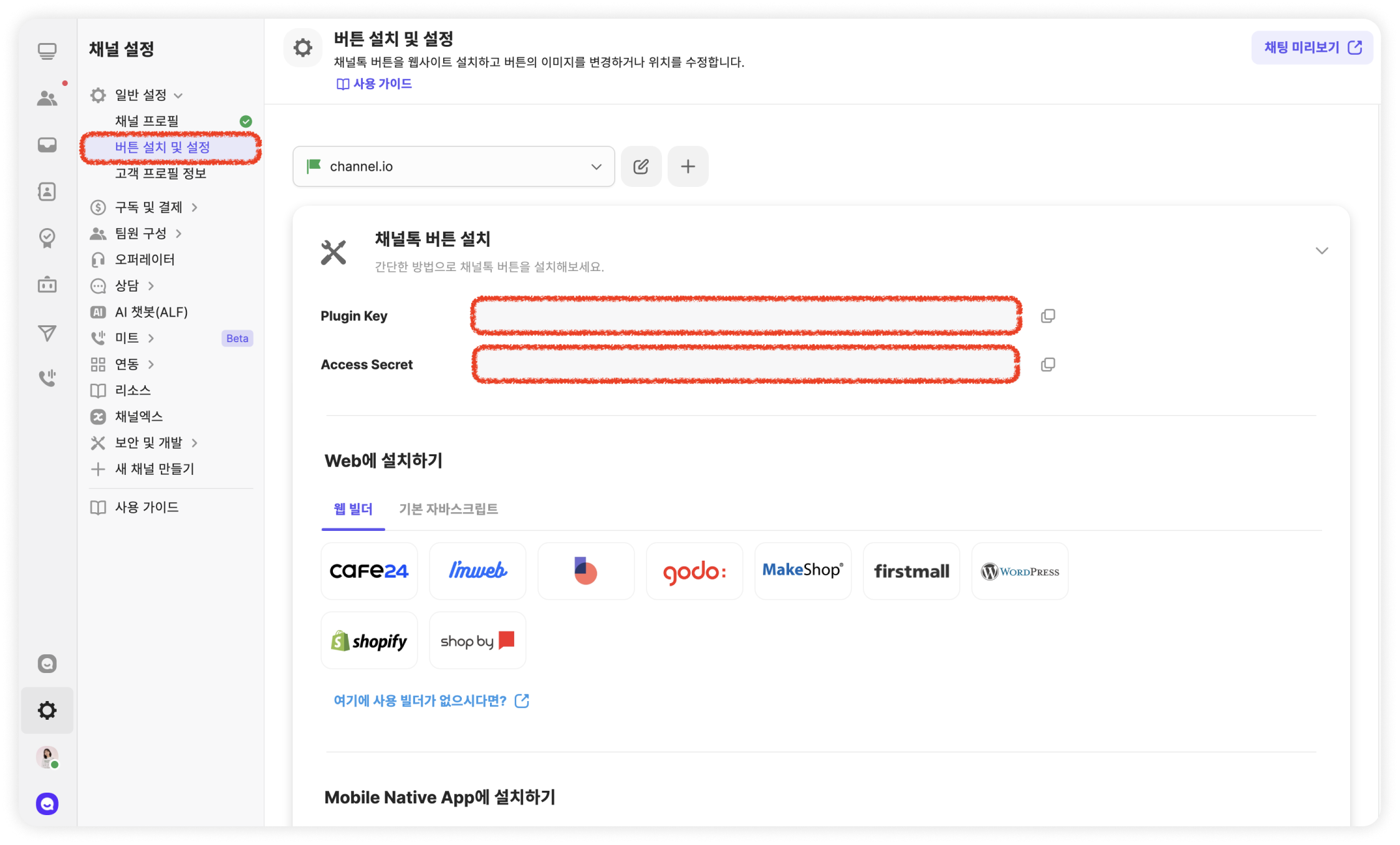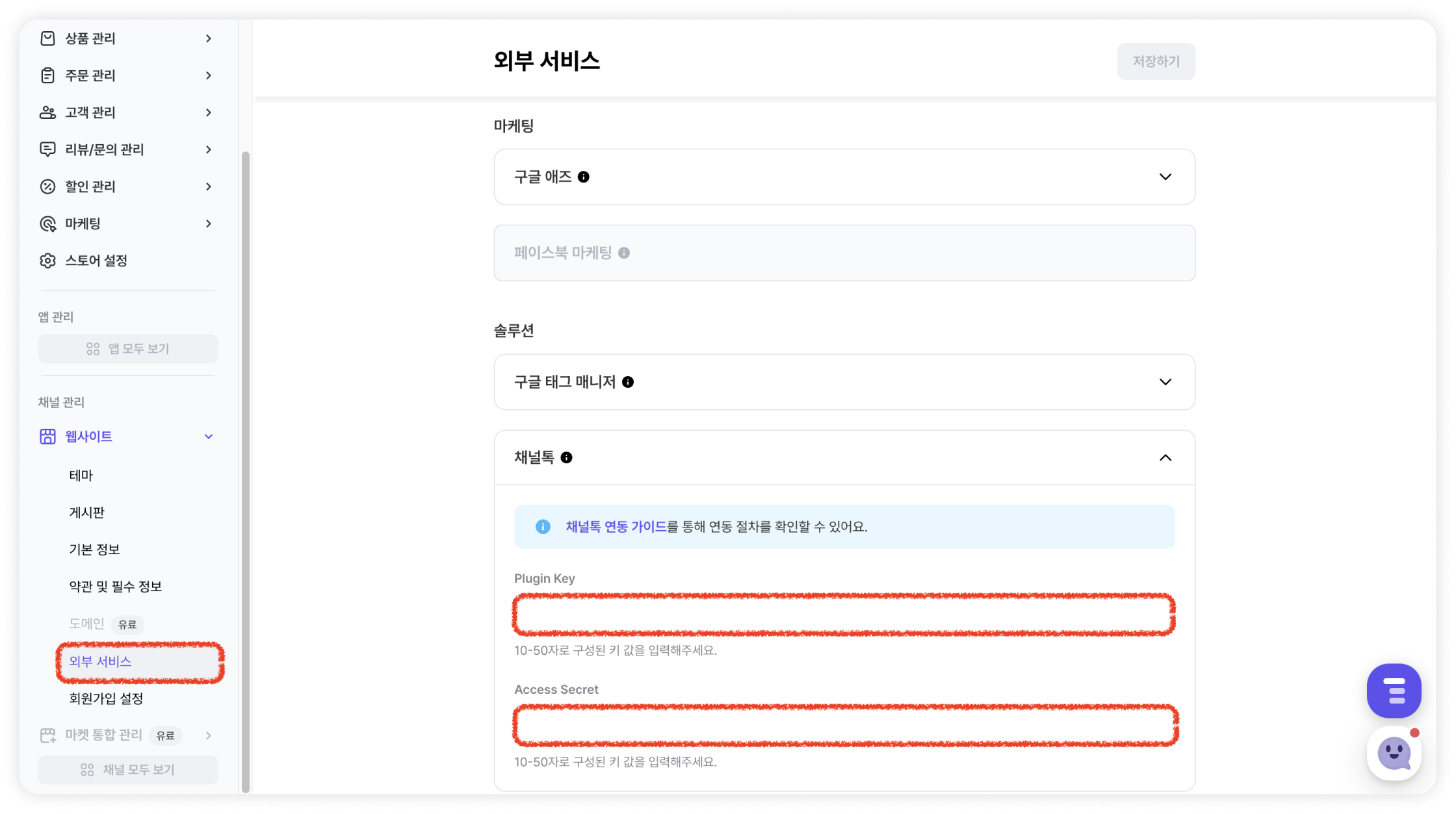 [식스샵 프로] > [웹사이트] > [외부 서비스] > [채널톡]의 'Plugin Key'와 'Access Secret'를 각각 붙여넣기 해주세요.